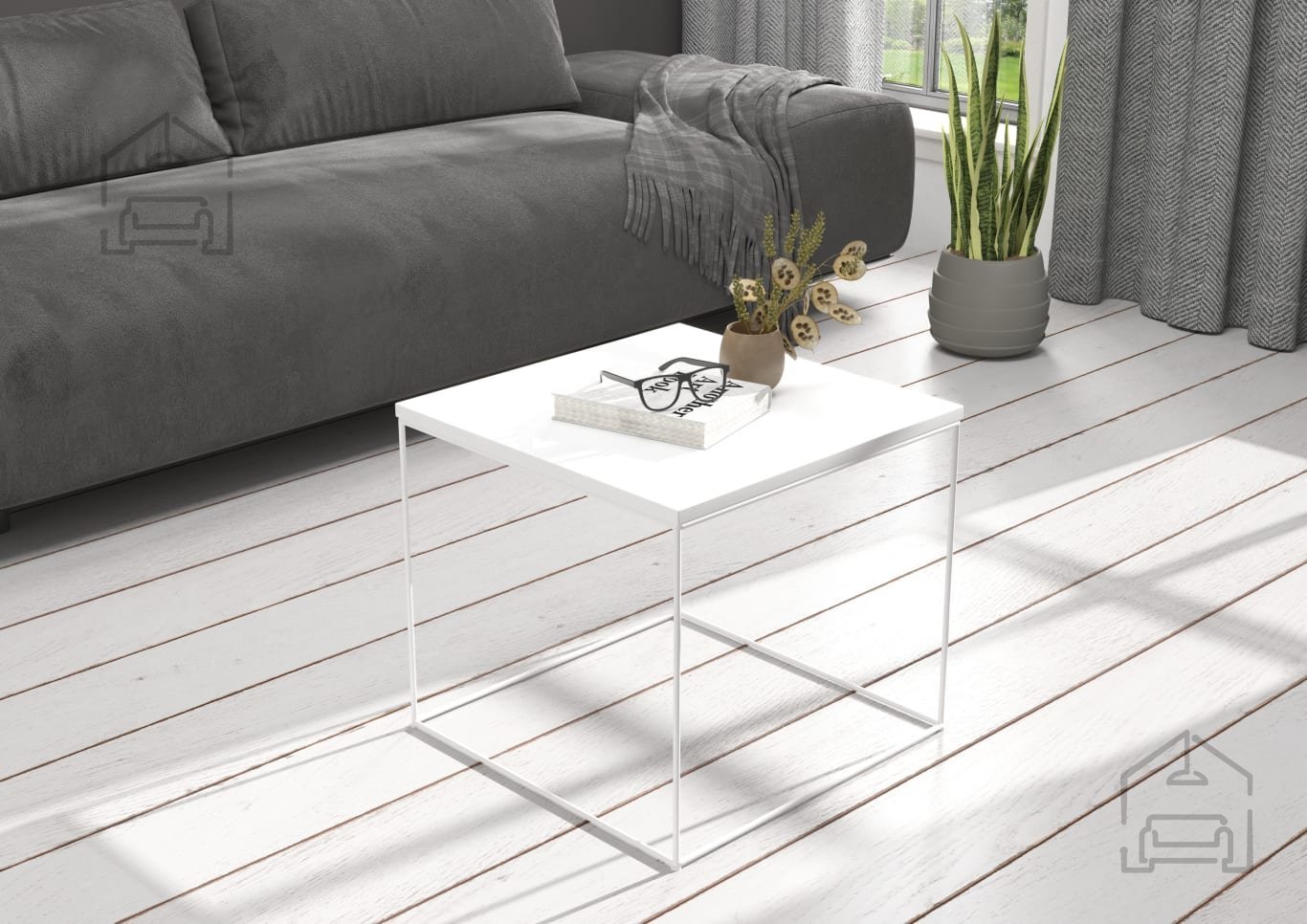 Der Couchtisch Elena mit den Maßen 50x50x45 cm vereint modernes Design mit hoher Funktionalität. Sein einzigartiger Weißton verleiht jedem Zuhause einen Hauch von industriellem Chic. Gefertigt aus einer 18 mm starken laminierten Platte überzeugt er durch Stabilität und Langlebigkeit, während die Beine aus 8 mm starkem Metalldraht für sicheren Stand und einen eleganten Look sorgen.