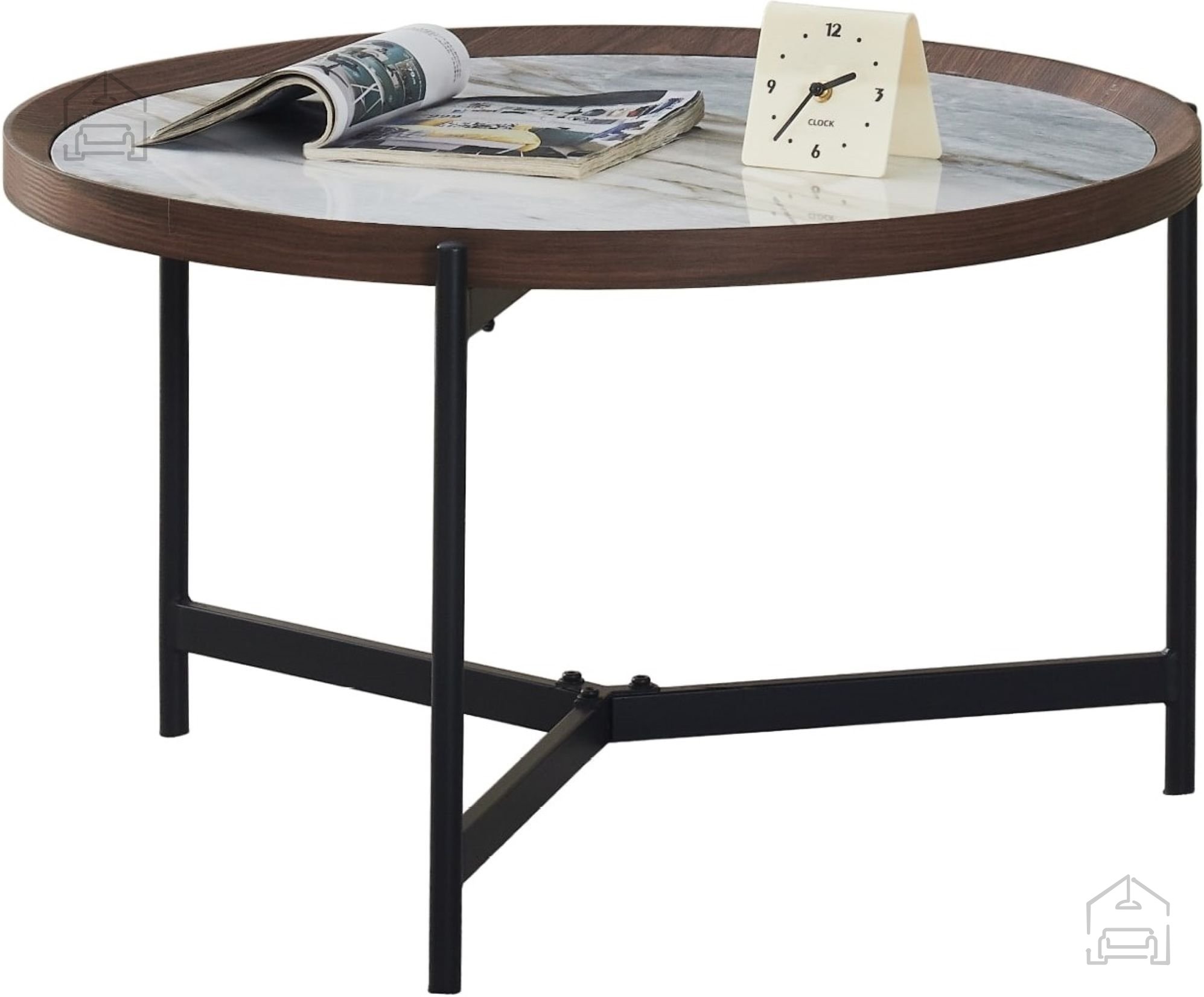 Ein interessanter runder Couchtisch, der sich mit seiner Kombination aus interessantem Design und Funktionalität gut in moderne Wohnräume einfügt. Die Tischplatte besteht aus 6 mm dicker, glänzend blau-weißer Keramik, mit einem Rahmen aus MDF-Material mit Papierfinish.