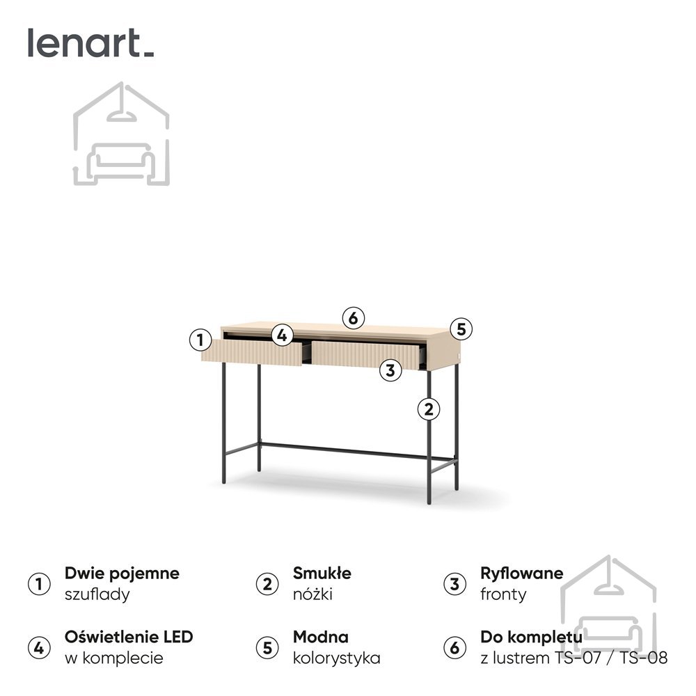 Predstavljamo vam Mizo za ličenje Trend TS-09, izdelek, ki združuje sodobno eleganco z izjemno funkcionalnostjo. Ta elegantna miza za ličenje ni le pohištveni kos, temveč pravo umetniško delo, ki bo vašo spalnico dvignilo na povsem novo raven. Z dimenzijami 112x40x78 cm je idealna za vsak prostor, ne glede na velikost, in ponuja vse, kar potrebujete za brezhibno urejanje in organizacijo.