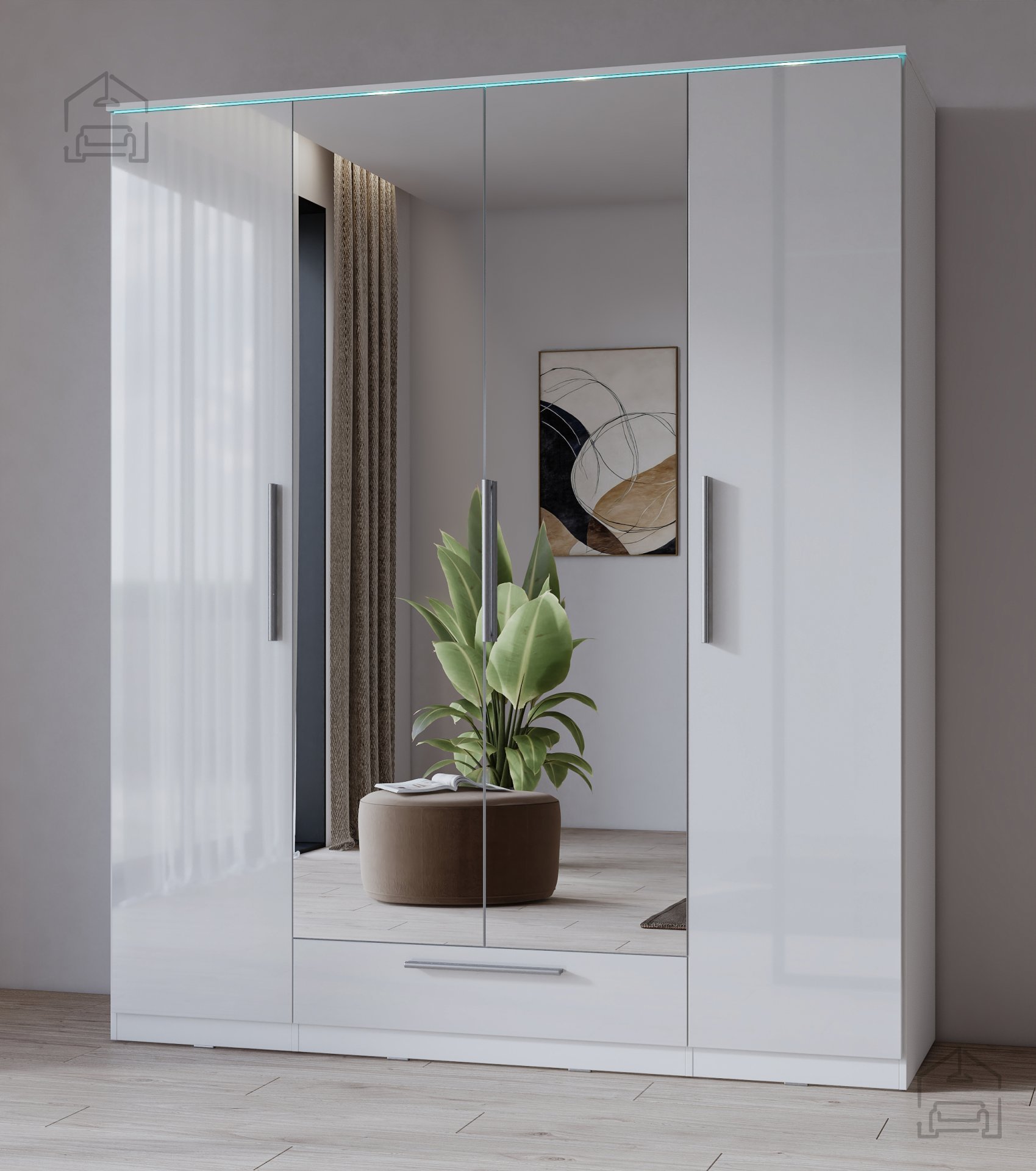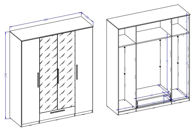 Der Schrank wurde mit Blick auf Alltagstauglichkeit entworfen. Er bietet vier Türen und eine Schublade für eine optimale Organisation von Kleidung, Schuhen und Accessoires. Jeder Bereich ist so gestaltet, dass Sie möglichst viel Stauraum zur Verfügung haben – für eine stets ordentliche und übersichtliche Garderobe.