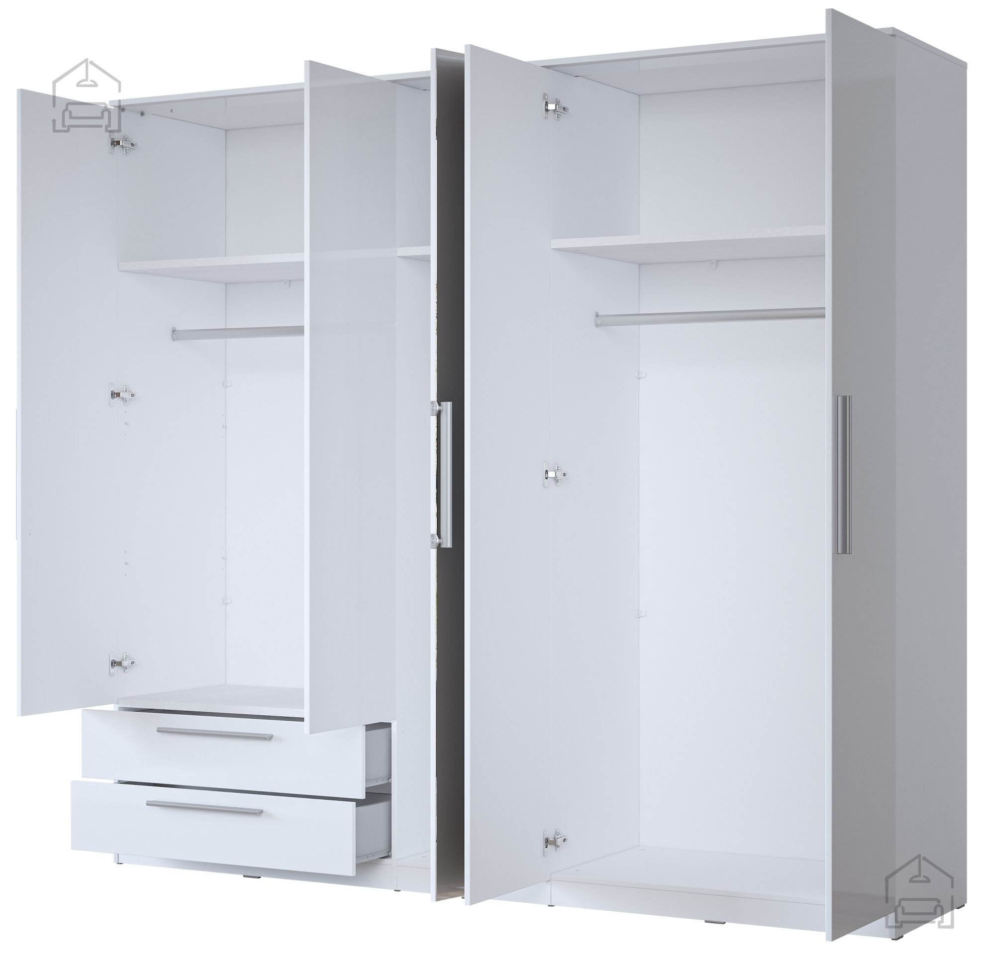 Wir präsentieren Ihnen den wunderschönen Kleiderschrank India S 2 in edlem Weiß, der Ihrem Raum eine Portion Eleganz und Modernität verleiht. Dieser großzügige Schrank mit den Maßen 225x60x215 cm wurde mit Blick auf zeitgemäße Ansprüche und Ästhetik entworfen. Gefertigt aus einer hochwertigen Möbelplatte mit 15 mm Stärke, überzeugt er durch Langlebigkeit und Stabilität. Die Rückwand besteht aus einer 3 mm starken HDF-Platte, die zusätzliche Festigkeit und Robustheit bietet.