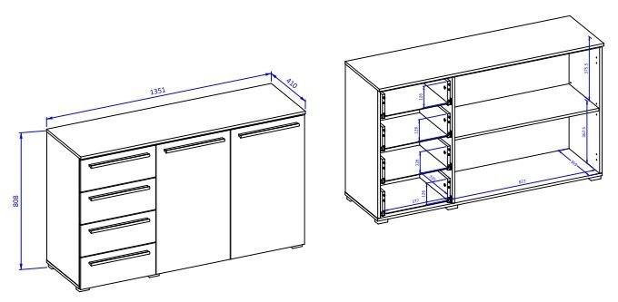 Mit den Abmessungen von 135 x 41 x 81 cm passt die Kommode India S perfekt in verschiedene Wohnbereiche – vom Wohnzimmer bis ins Schlafzimmer. Sie besteht aus einer 15 mm starken Möbelplatte und einer 3 mm starken Rückwand aus HDF-Platte, was Stabilität und Langlebigkeit garantiert. ABS-Kanten sorgen zusätzlich für Schutz und Widerstandsfähigkeit, damit die Kommode lange schön bleibt.