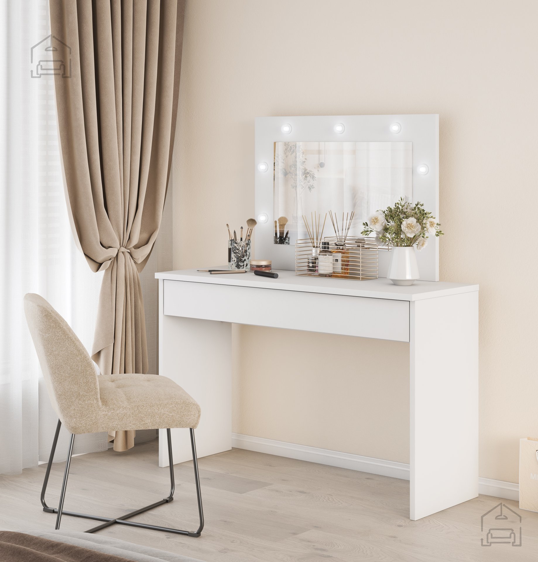 Mit dem Schminktisch Eva – Weiß – 2497NX49 investieren Sie in einen persönlichen Wohlfühlort, an dem Sie sich schön und organisiert fühlen. Dieses Möbelstück ist mehr als nur ein Tisch – es ist Ausdruck Ihres individuellen Stils und Geschmacks. Durch seine Funktionalität und das elegante Design ist er die ideale Wahl für alle, die ihre Morgenroutine verschönern und ihrem Zuhause einen Hauch von Luxus verleihen möchten.