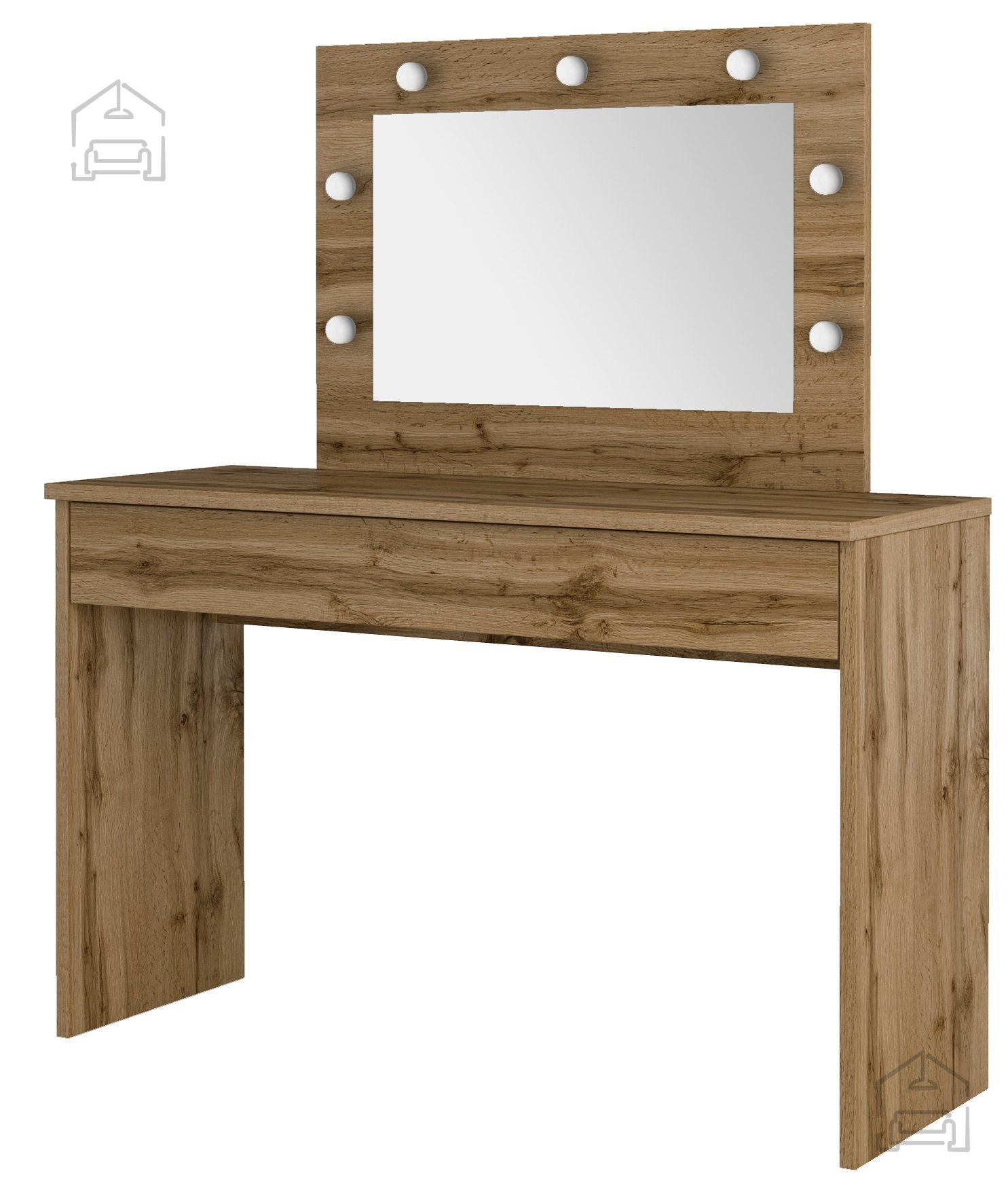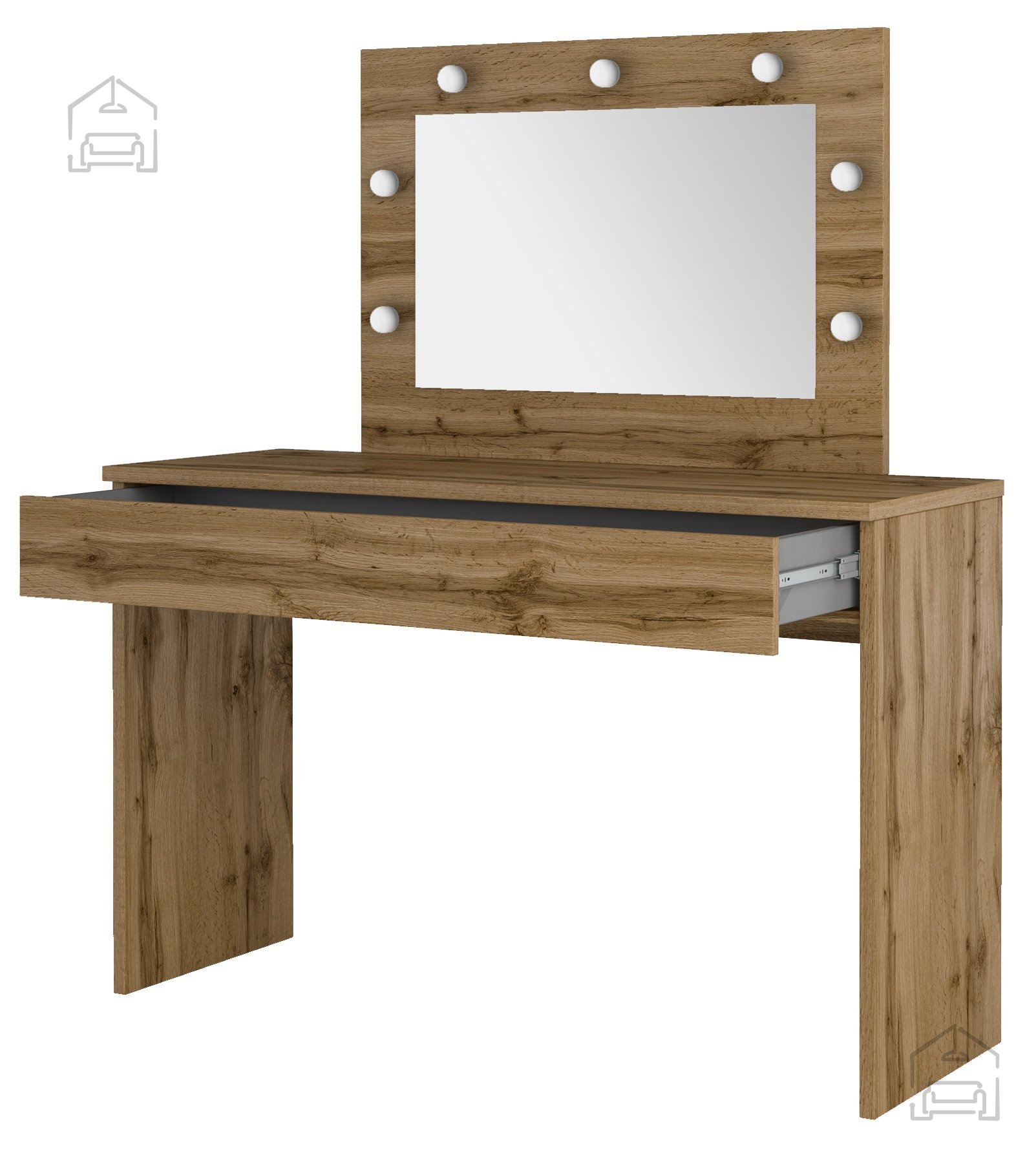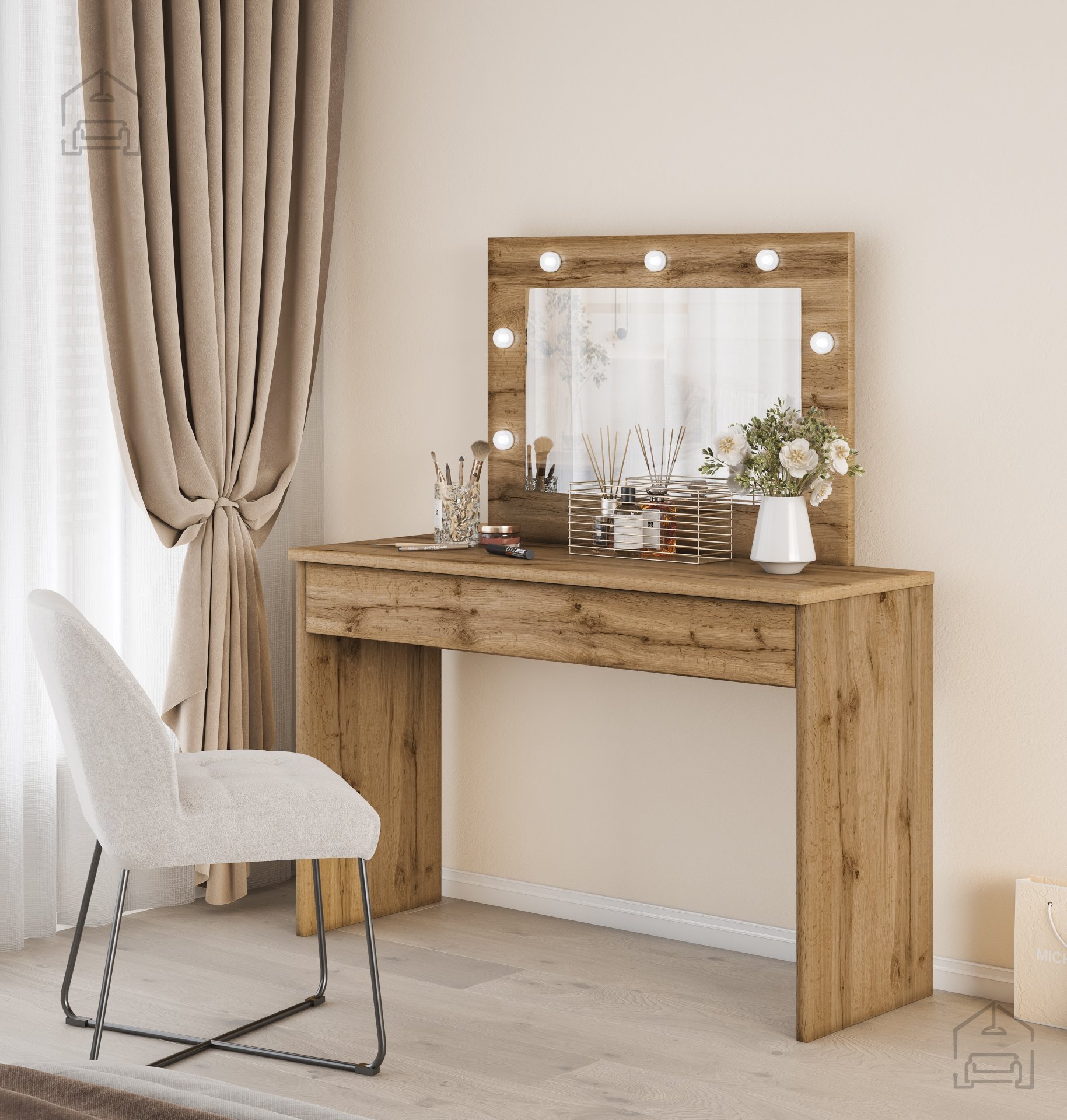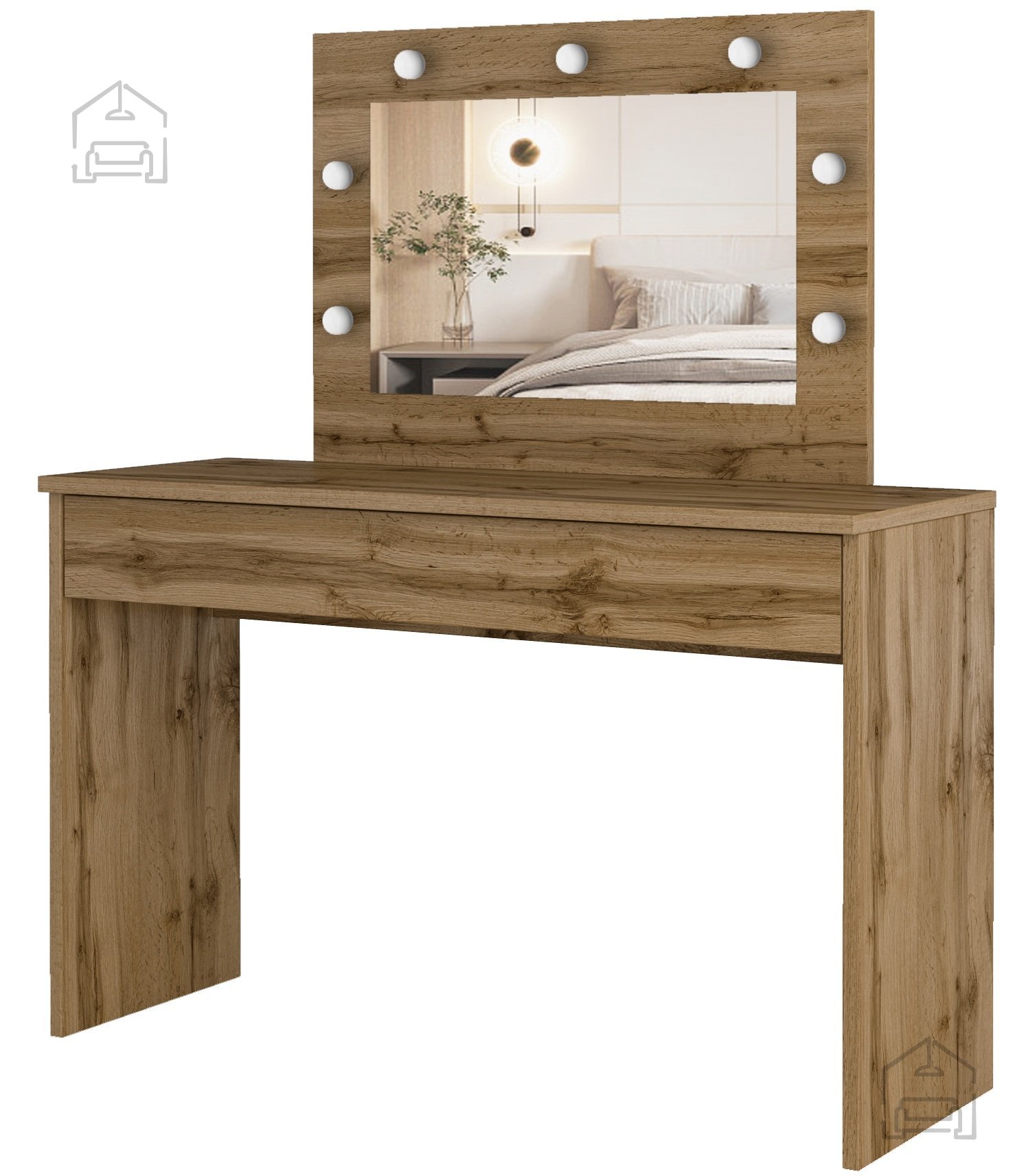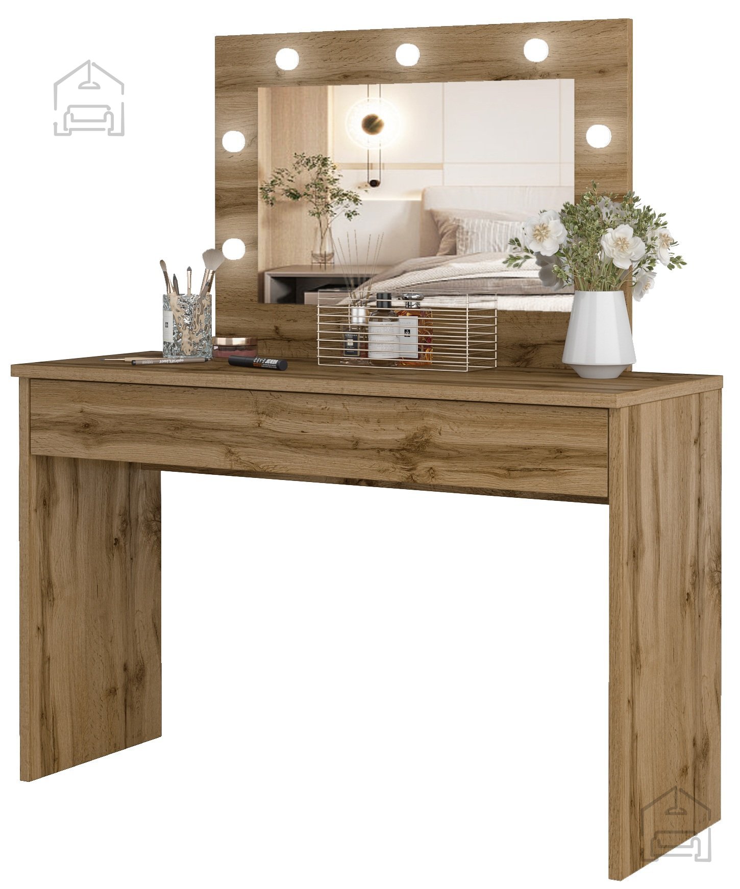 Wir präsentieren Ihnen den wunderschönen Schminktisch Eva in Eiche Wotan – nicht nur ein Möbelstück, sondern ein echtes kleines Refugium für Ihren individuellen Stil und Ihre täglichen Schönheitsrituale. Mit den Maßen 118x42x135 cm ist er die ideale Ergänzung für jedes Schlafzimmer oder Ankleidezimmer, das Ästhetik und praktische Nutzung miteinander verbinden möchte.
