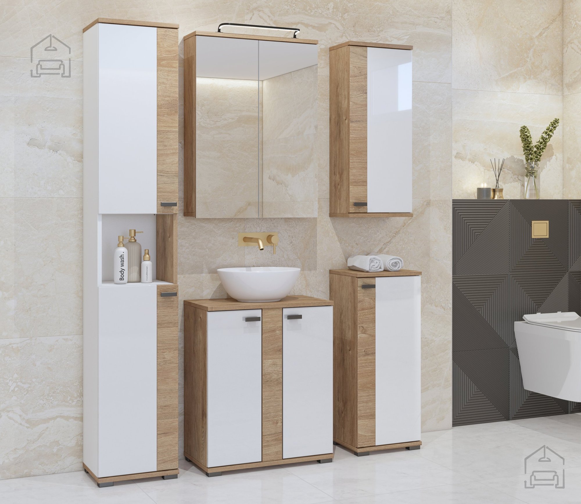 Die Kombination aus Goldener Harbor-Eiche und Weiß lässt sich wunderbar mit verschiedensten Einrichtungsstilen – von klassisch bis modern – kombinieren. Das MDF-Material sorgt dafür, dass der Schrank über viele Jahre hinweg seinen schönen Look und seine Funktionalität behält.