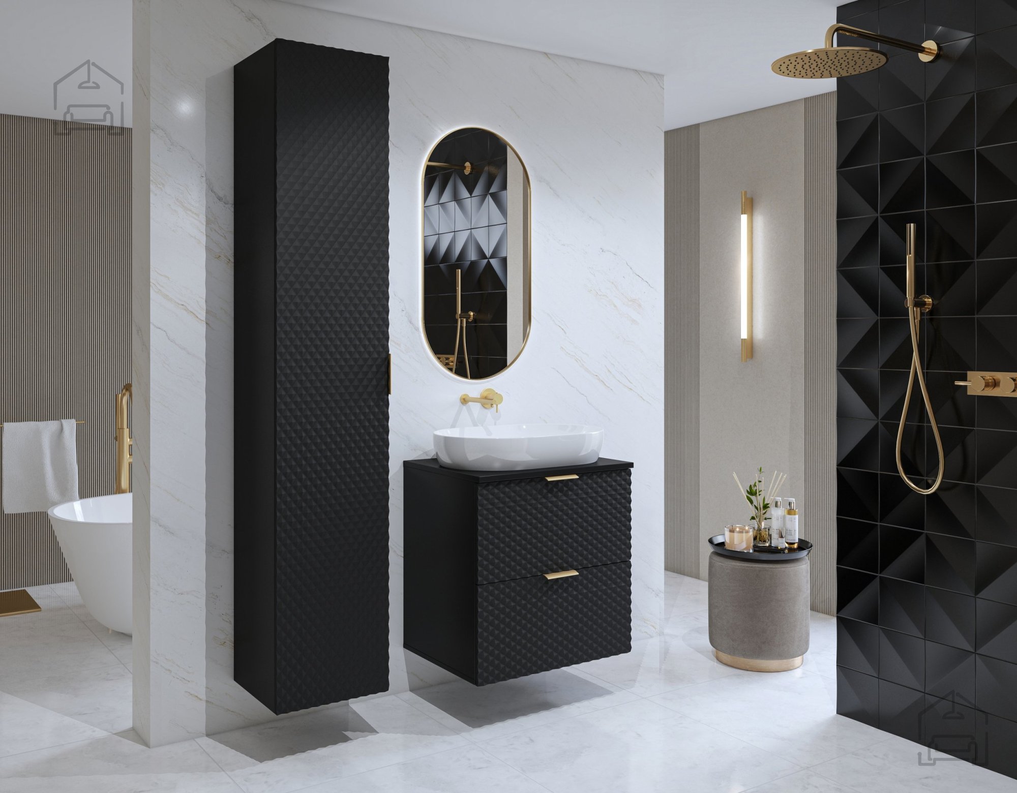 Ein weiteres Highlight sind die goldfarbenen Griffe, die dem Ensemble einen Hauch von Exklusivität verleihen und perfekt mit dem eleganten Schwarz harmonieren. Die strukturierten Fronten bringen zusätzliche Tiefe ins Design und passen wunderbar zu modernen Badezimmertrends.