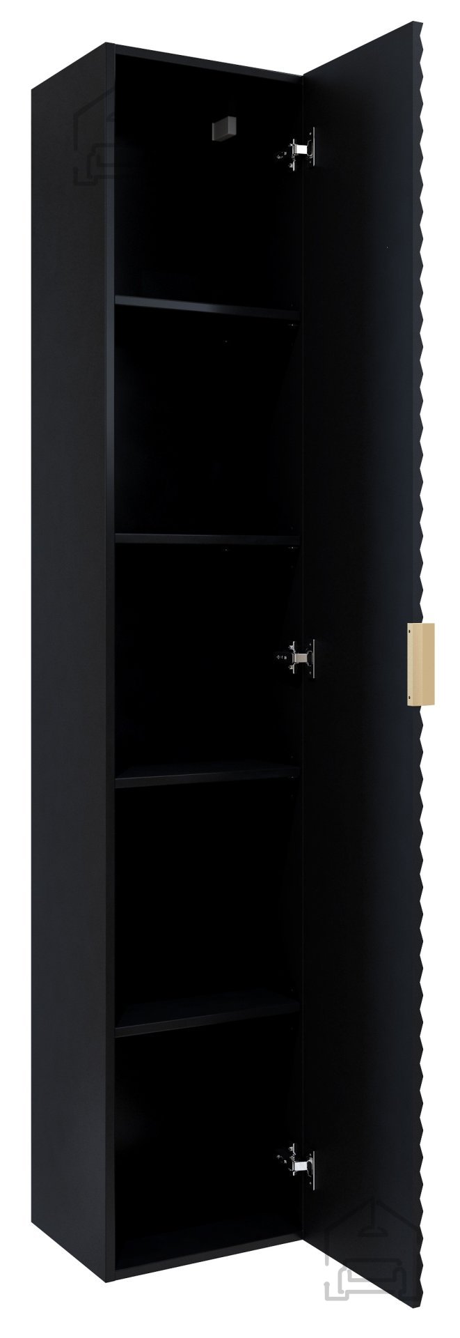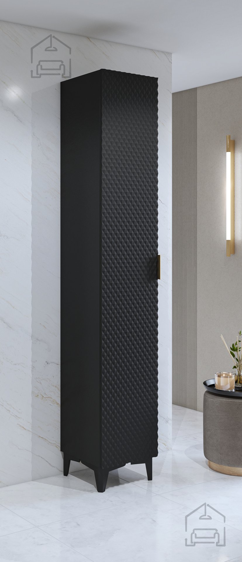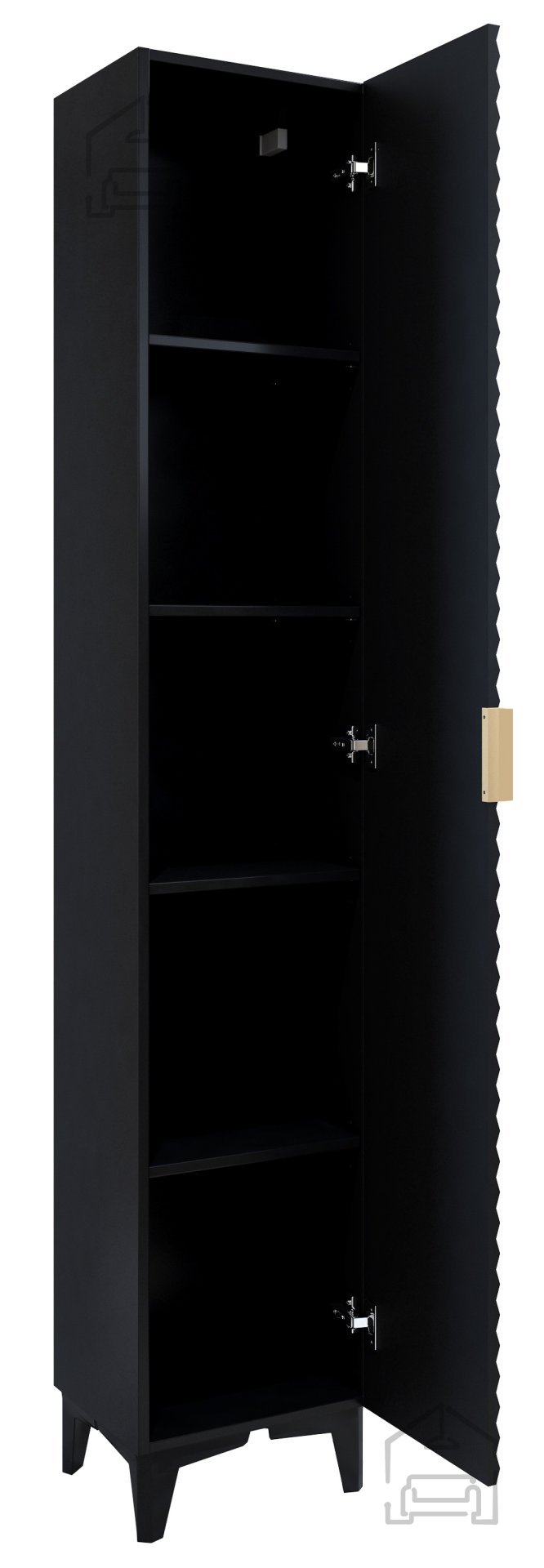 Die Maße des Schranks betragen 35x35x186 cm – kompakt genug für kleinere Räume, aber dennoch großzügig für größere Wohnbereiche. Der Korpus besteht aus hochwertiger, laminierten Spanplatte, die für Stabilität und Langlebigkeit sorgt. Die Fronten sind aus MDF gefertigt, was dem Schrank eine edle Optik verleiht und ihn widerstandsfähiger gegen tägliche Beanspruchung macht. Die schwarze Farbe bringt einen Hauch von Eleganz ins Zuhause und lässt sich mühelos mit verschiedensten Einrichtungsstilen kombinieren.