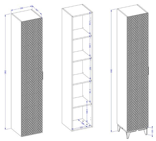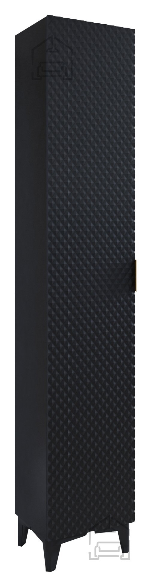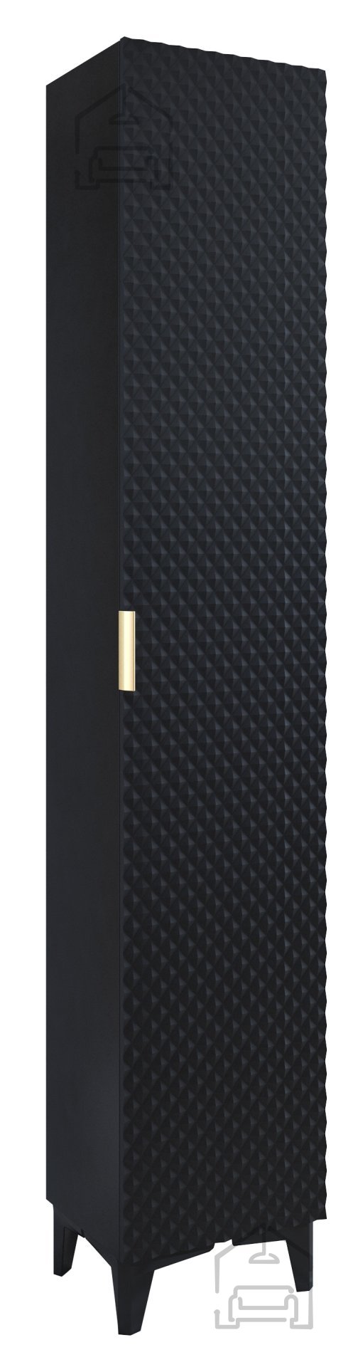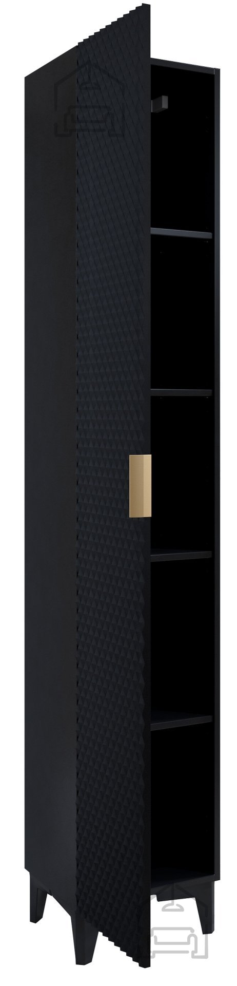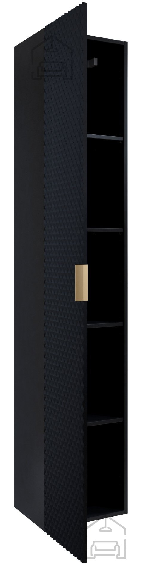 Die Maße des Schranks betragen 35x35x186 cm – kompakt genug für kleinere Räume, aber dennoch großzügig für größere Wohnbereiche. Der Korpus besteht aus hochwertiger, laminierten Spanplatte, die für Stabilität und Langlebigkeit sorgt. Die Fronten sind aus MDF gefertigt, was dem Schrank eine edle Optik verleiht und ihn widerstandsfähiger gegen tägliche Beanspruchung macht. Die schwarze Farbe bringt einen Hauch von Eleganz ins Zuhause und lässt sich mühelos mit verschiedensten Einrichtungsstilen kombinieren.