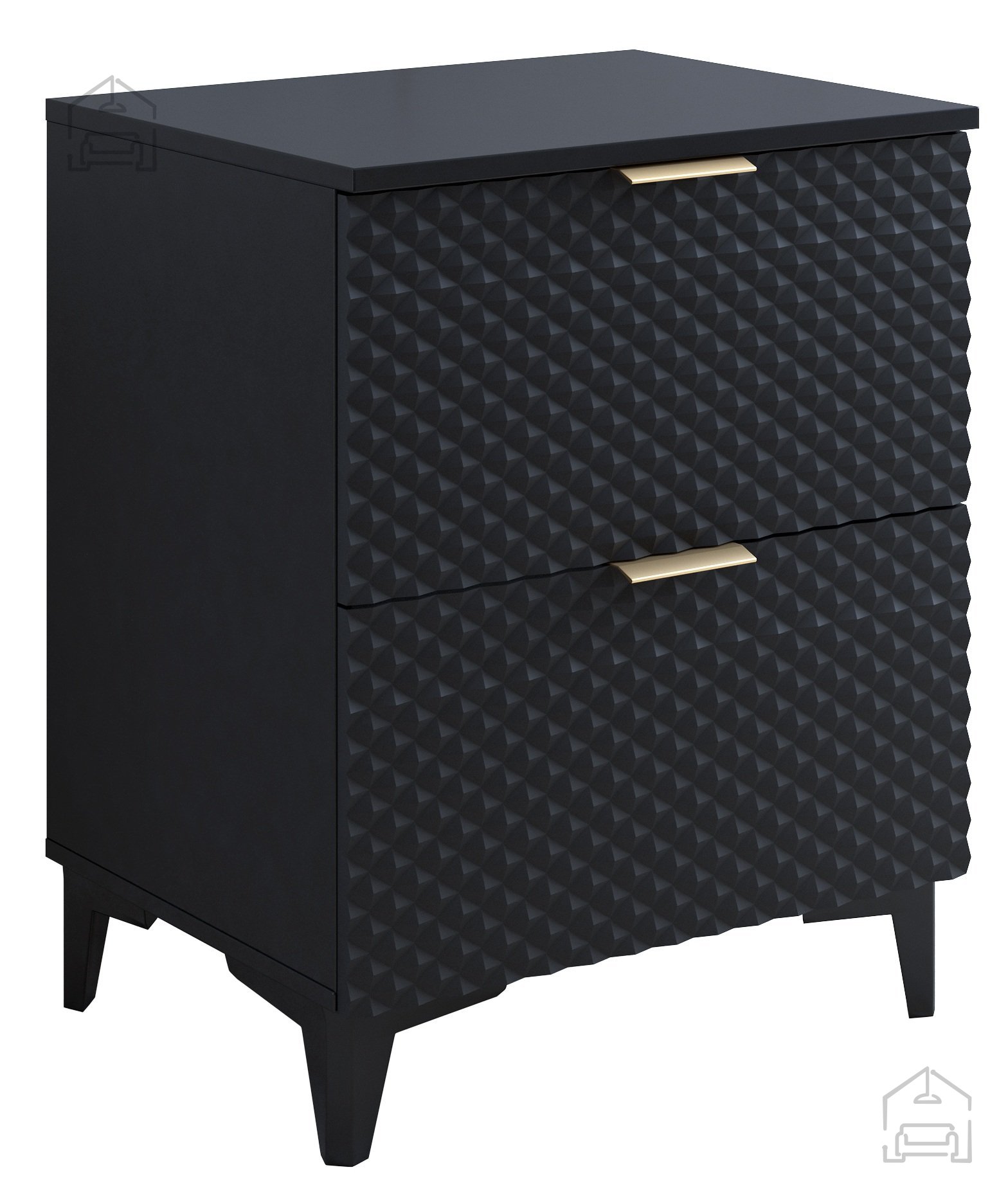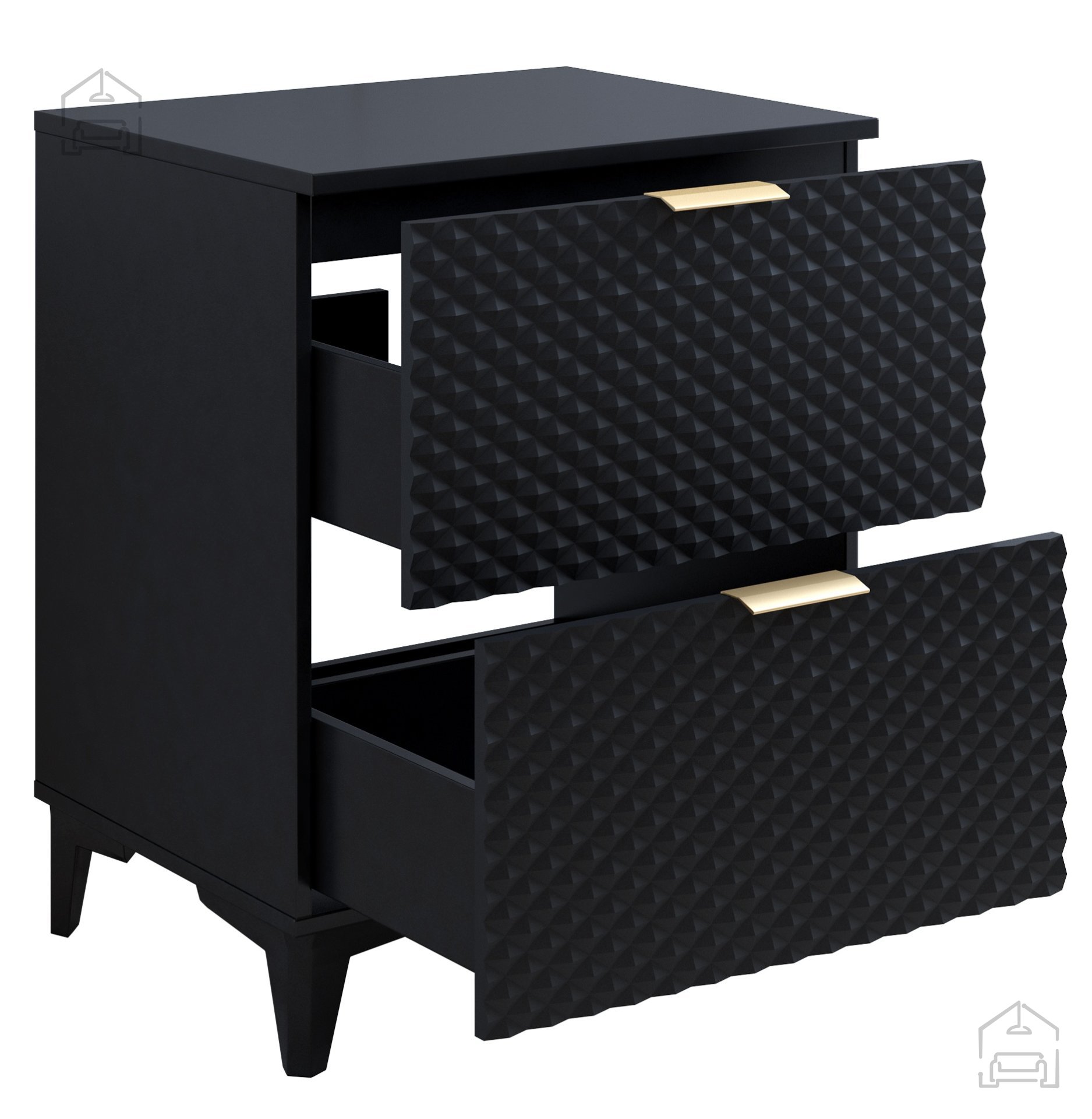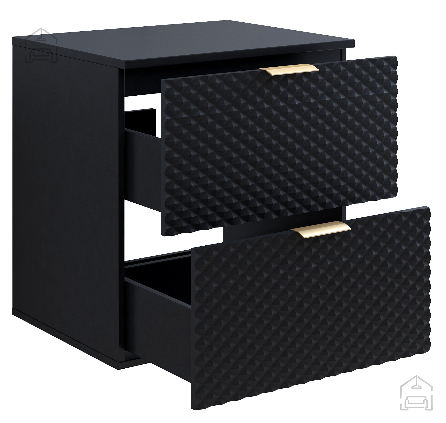 Besonderes Augenmerk wurde auf die kleinen, aber feinen Details gelegt, die dem Schrank Laura eine luxuriöse Ausstrahlung verleihen. Griffe in Gold setzen einen sanften Kontrast und unterstreichen das edle Erscheinungsbild, das perfekt mit dem Schwarz harmoniert. Die strukturierte Oberfläche der Türen sorgt nicht nur für eine ansprechende Optik, sondern auch für eine angenehme Haptik.