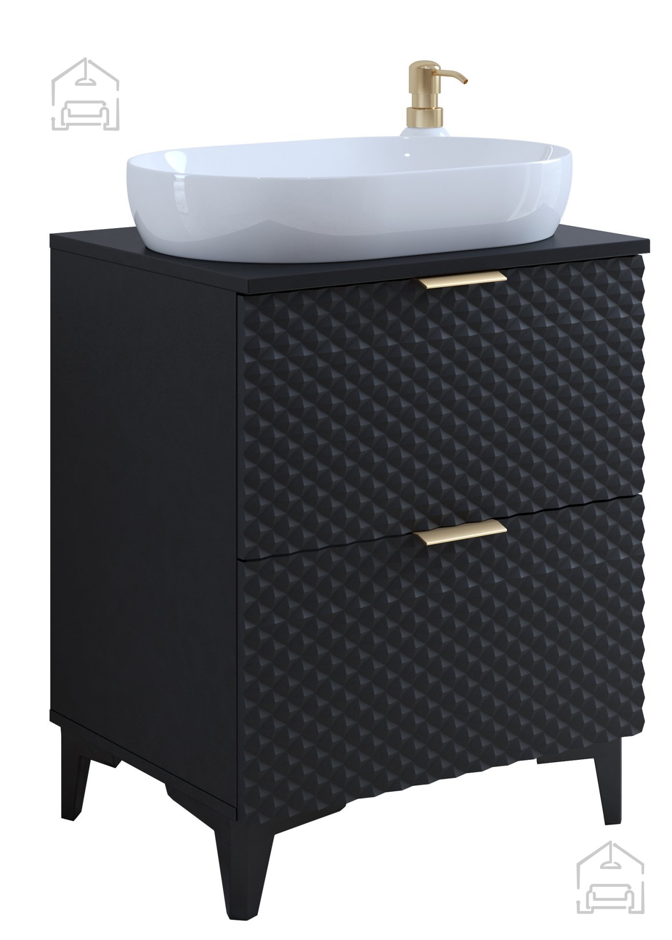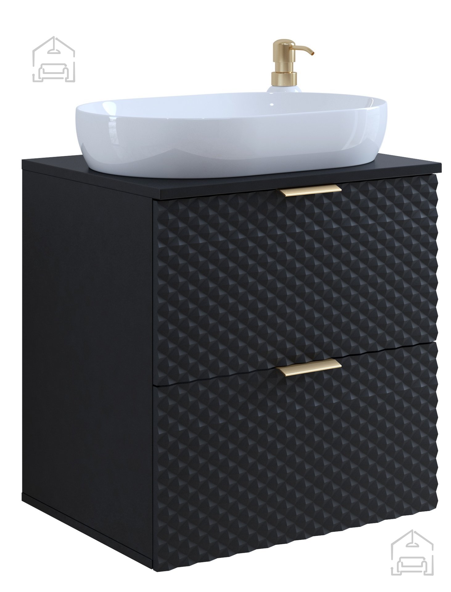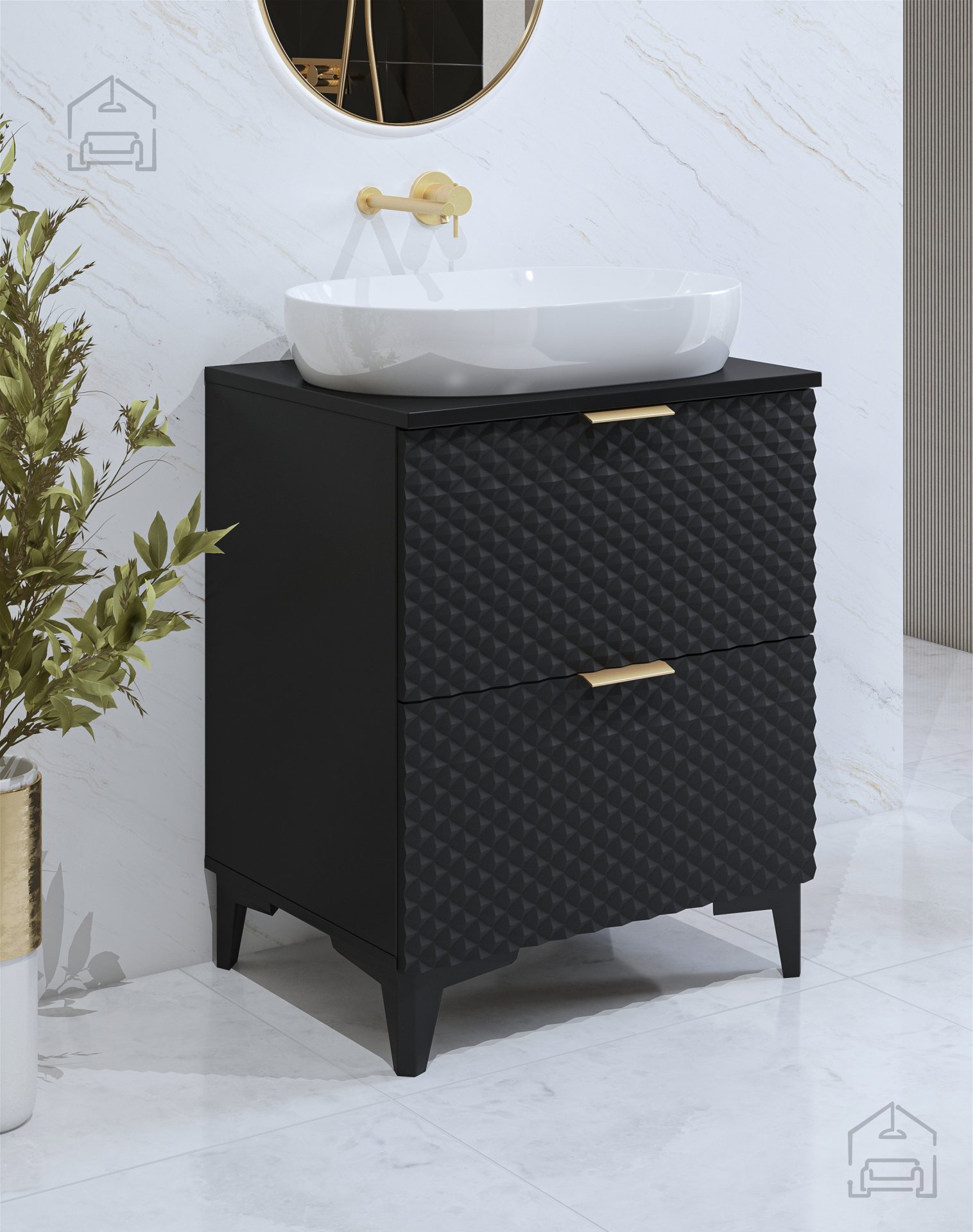 Der Schrank Laura wurde sorgfältig konzipiert, um den verfügbaren Raum optimal zu nutzen. Mit den Maßen 60x49x63 cm lässt er sich in verschiedenste Badezimmereinrichtungen integrieren. Der Korpus besteht aus robuster, laminierten Spanplatte, die für Langlebigkeit und Feuchtigkeitsbeständigkeit sorgt. Die Fronten sind aus MDF gefertigt – das verleiht dem Möbelstück eine elegante Optik und macht es zugleich pflegeleicht. Das schwarze Finish bringt einen Hauch moderner Eleganz und Raffinesse in Ihr Badezimmer.