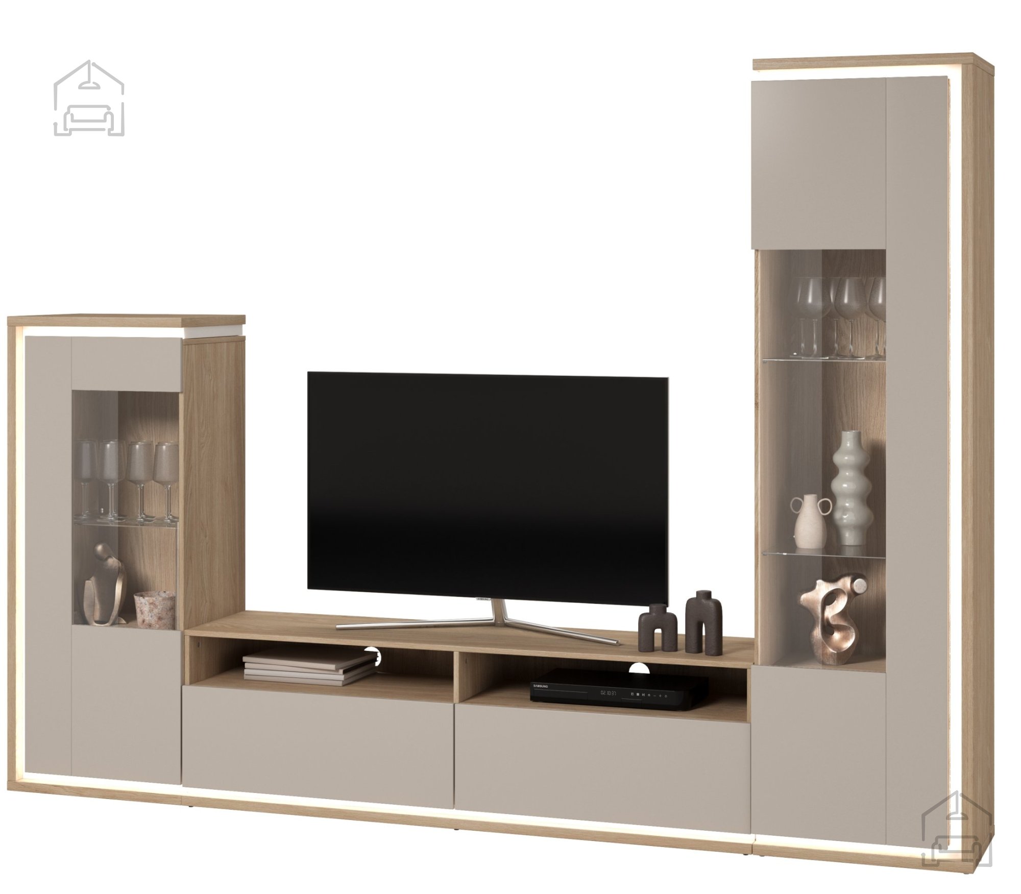 Wer seinem Wohnzimmer eine moderne Note verleihen möchte, kann die Wohnwand optional mit LED-Beleuchtung ausstatten. Diese sorgt nicht nur für eine stimmungsvolle Optik, sondern schafft auch eine angenehme, warme Atmosphäre – perfekt für gemütliche Abende mit Familie oder Freunden.