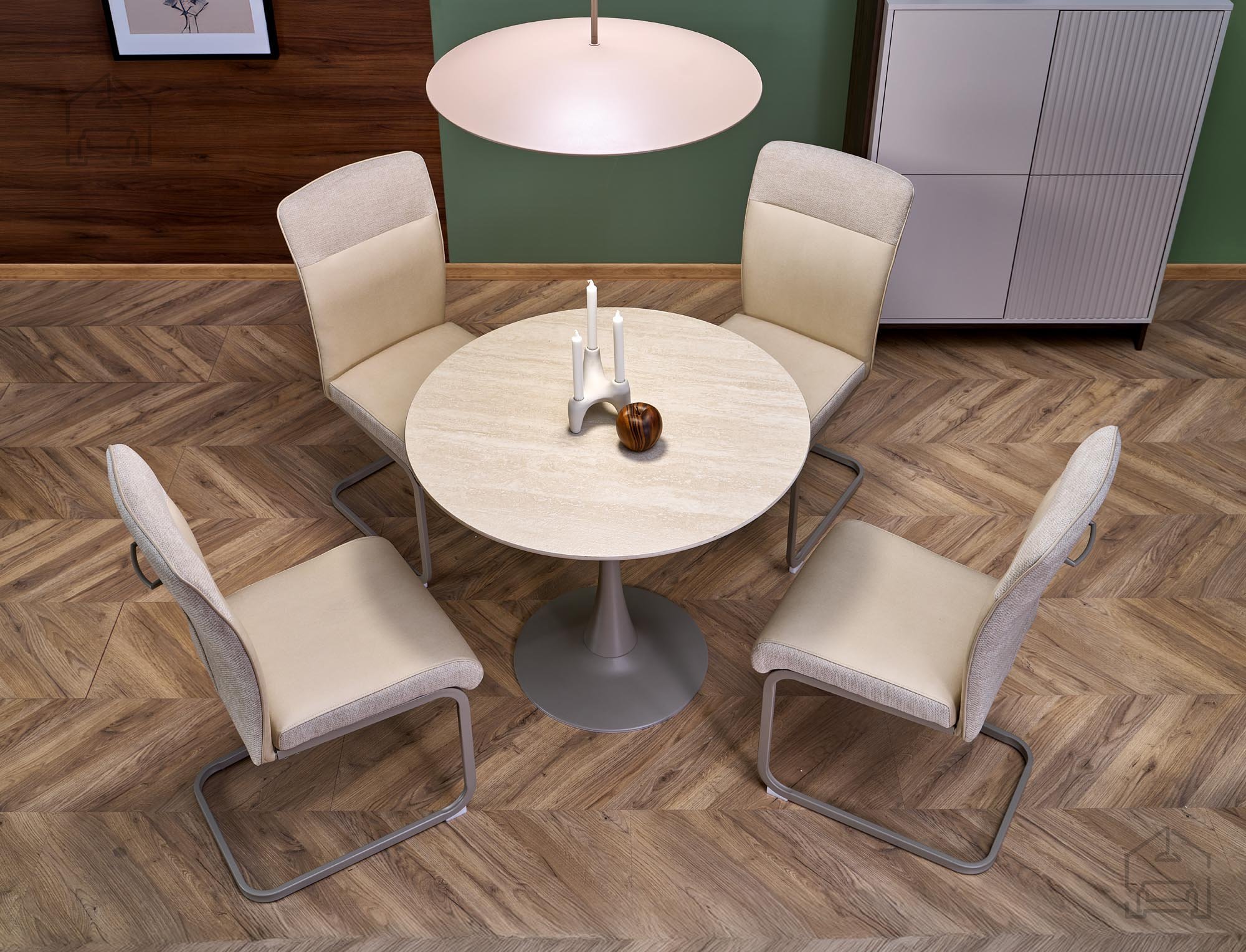 Wir präsentieren Ihnen den Esstisch Tolio, eine perfekte Kombination aus ästhetischem Design und hervorragender Funktionalität. Dieser Tisch hat die Maße 90x90x76 cm und ist aus äußerst hochwertigen Materialien gefertigt, einschließlich gesintertem Stein und pulverbeschichtetem Stahl. In seiner eleganten Travertin/Cashmere-Farbe fügt er sich perfekt in jede moderne Inneneinrichtung ein.