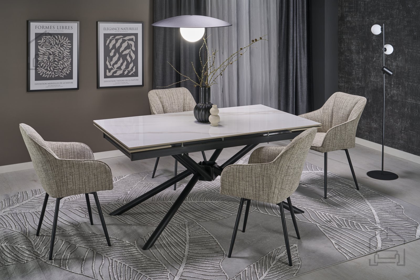 Der Tisch besticht durch eine zeitlose Kombination aus weißen Marmortönen auf der Oberfläche und einem schwarzen Gestell. Diese Farbkombination ermöglicht eine einfache Integration in jedes Interieur, sei es im modernen oder klassischen Stil. Der weiße Tisch mit Marmoroptik verleiht Ihrem Esszimmer einen Hauch von Luxus und Raffinesse.