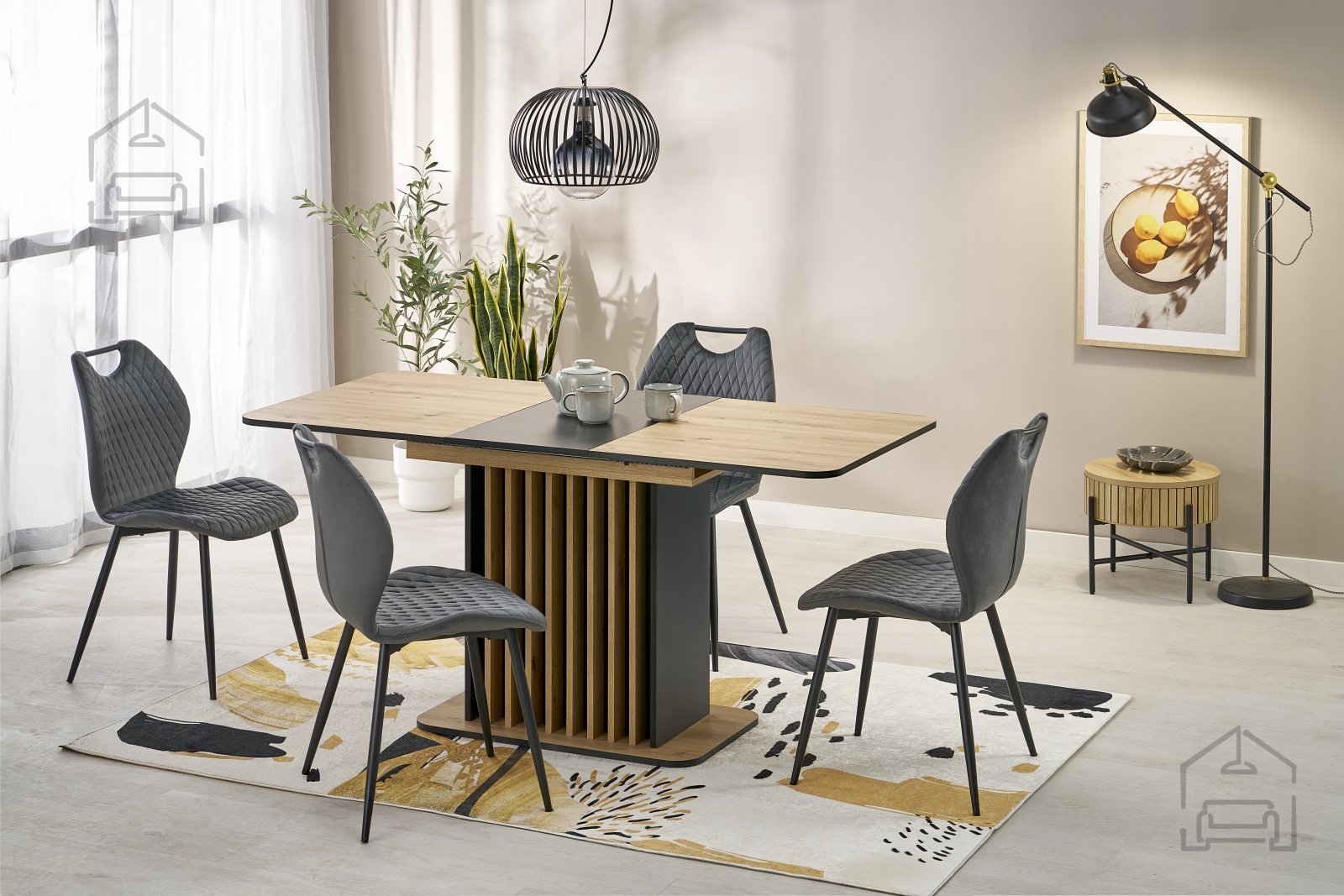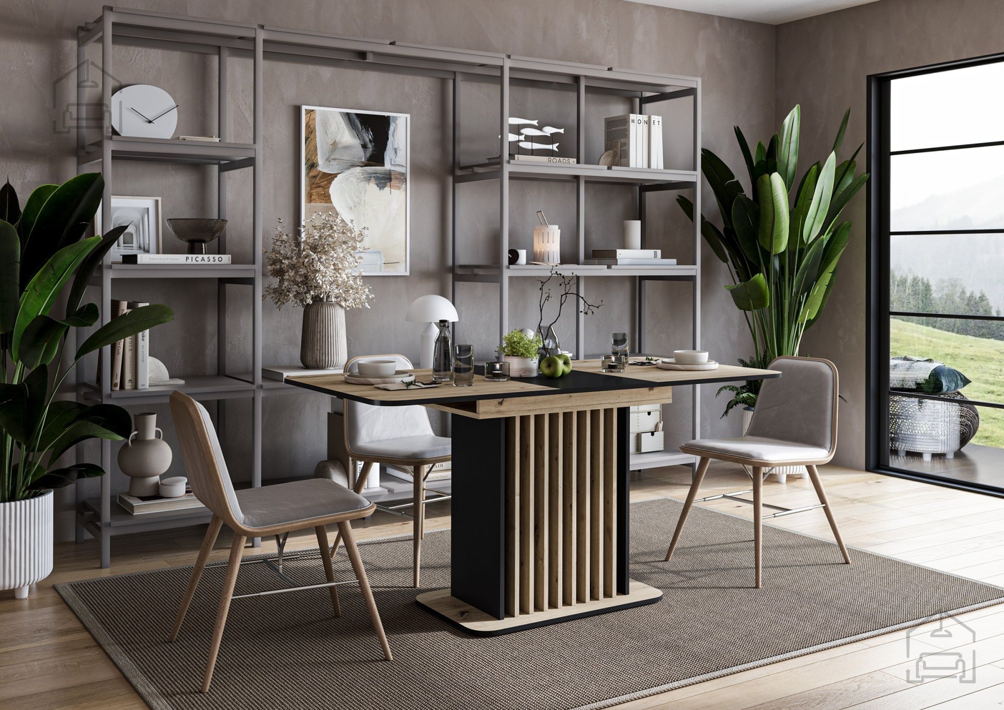 Die Grundabmessungen des Tisches betragen 120x77x77 cm, können jedoch leicht auf eine Länge von 158 cm erweitert werden. Diese Anpassungsfähigkeit ermöglicht es, dass der Tisch sowohl in kleinere als auch in größere Räume passt, was ideal für Wohnungen mit begrenztem Platz oder für diejenigen ist, die häufig größere Gruppen bewirten.