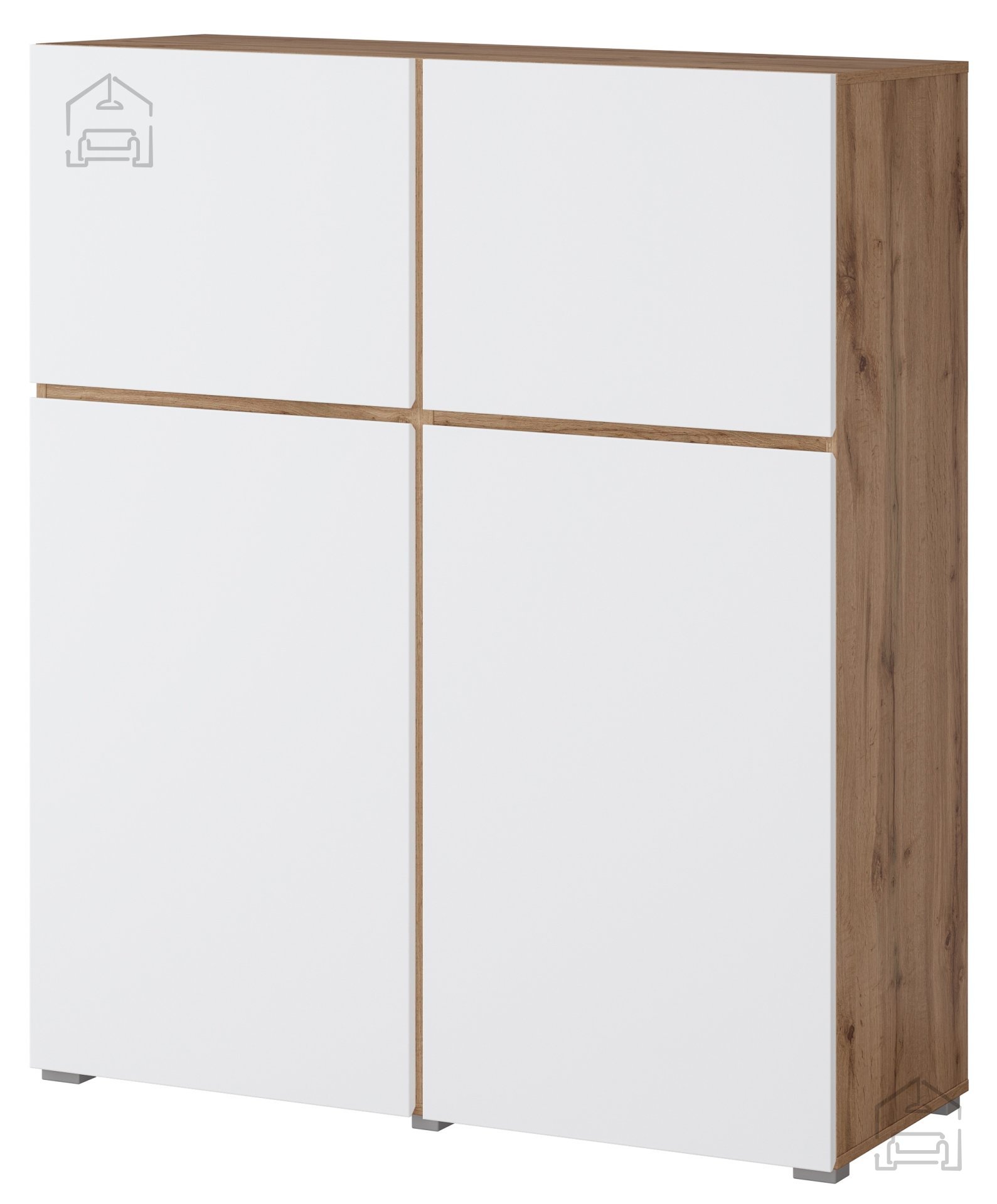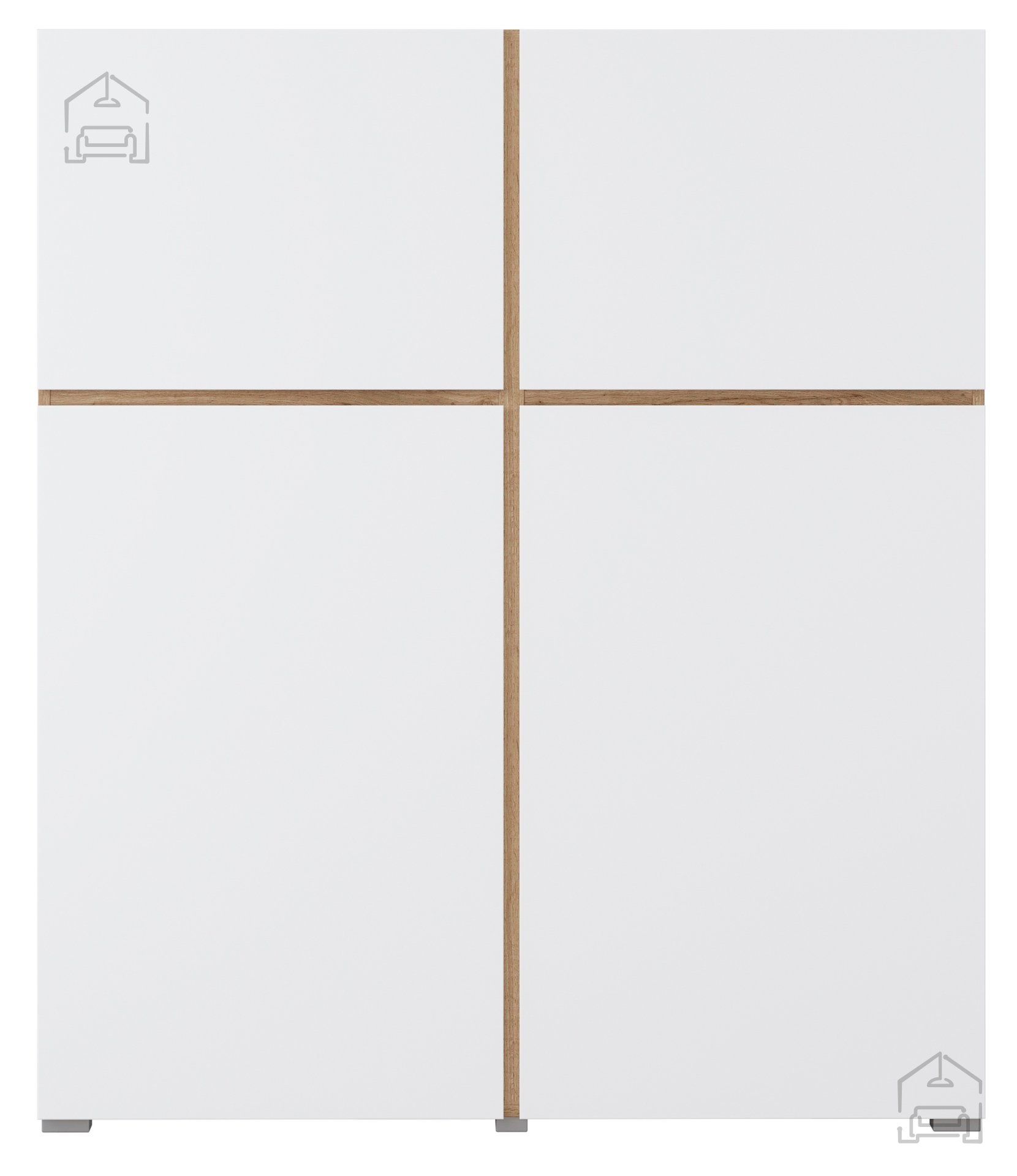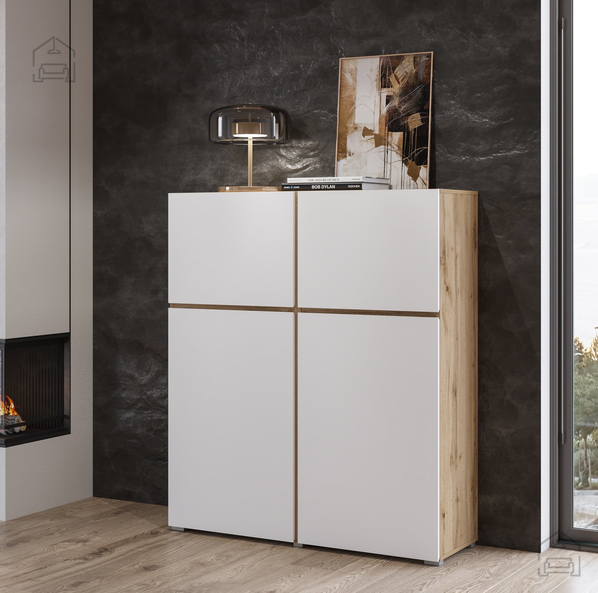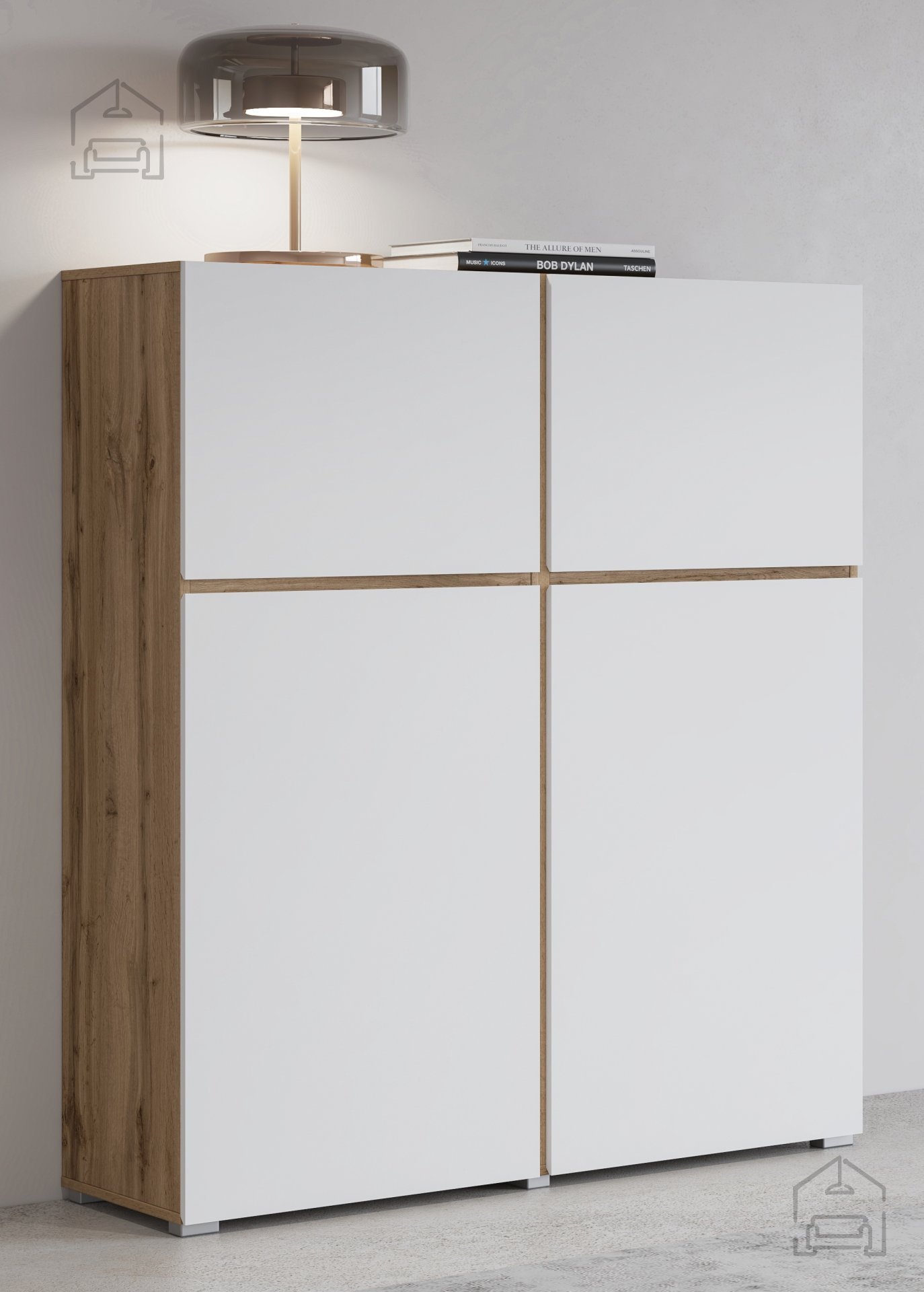 Das Modell ist in der Farbe Eiche Votan erhältlich, die für ihre Vielseitigkeit und natürliche Ausstrahlung bekannt ist. Diese Farbgebung verleiht Ihrem Zuhause eine warme, wohnliche Atmosphäre und bleibt dennoch modern. Das Weiß im Design sorgt zusätzlich für Frische und Helligkeit, sodass sich die Kommode problemlos in verschiedene Einrichtungsstile und Farbkonzepte einfügt.