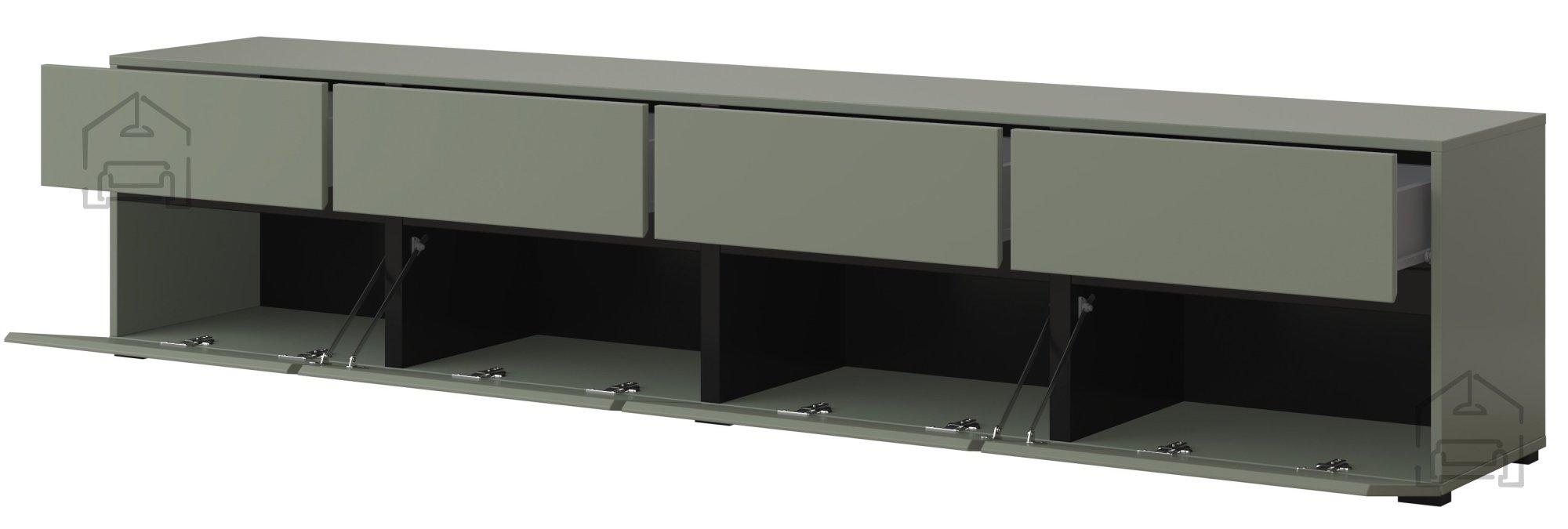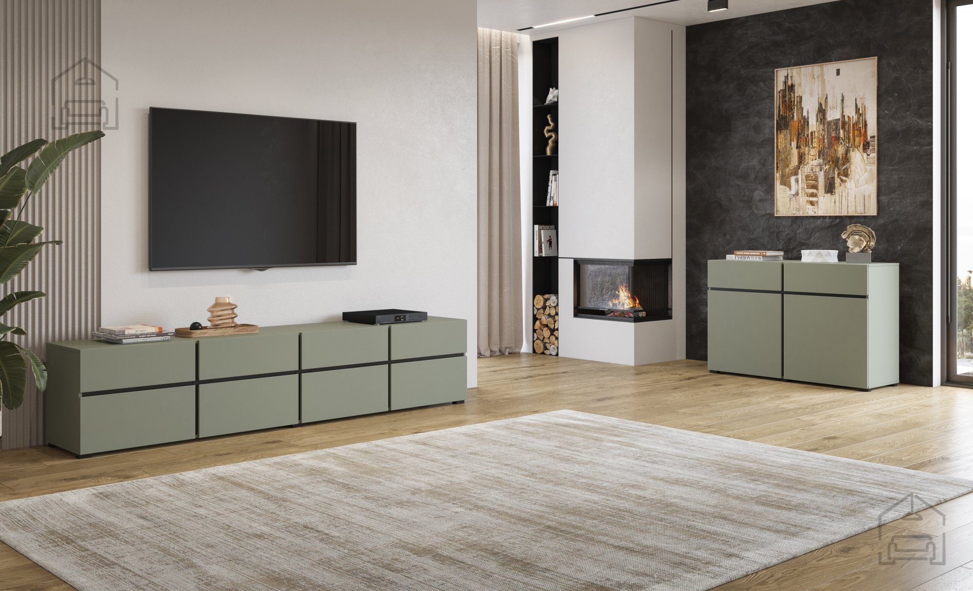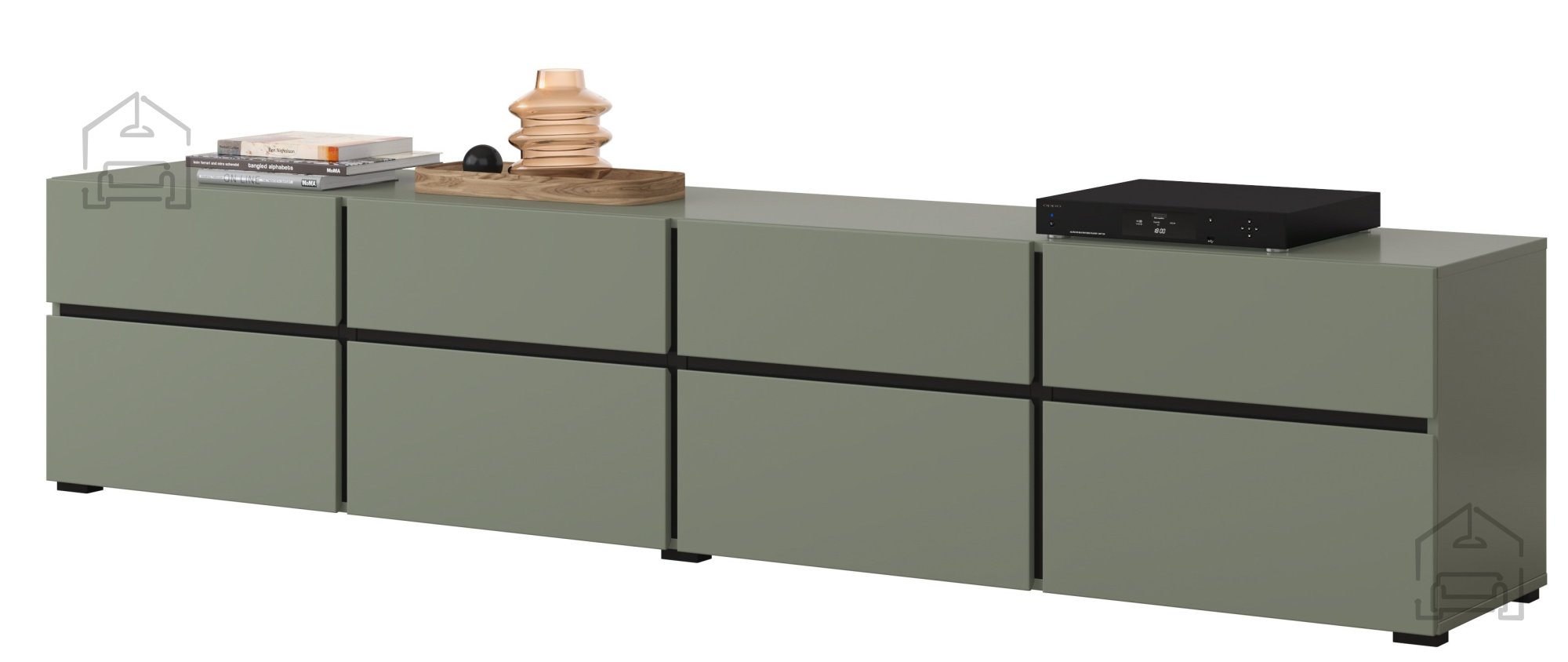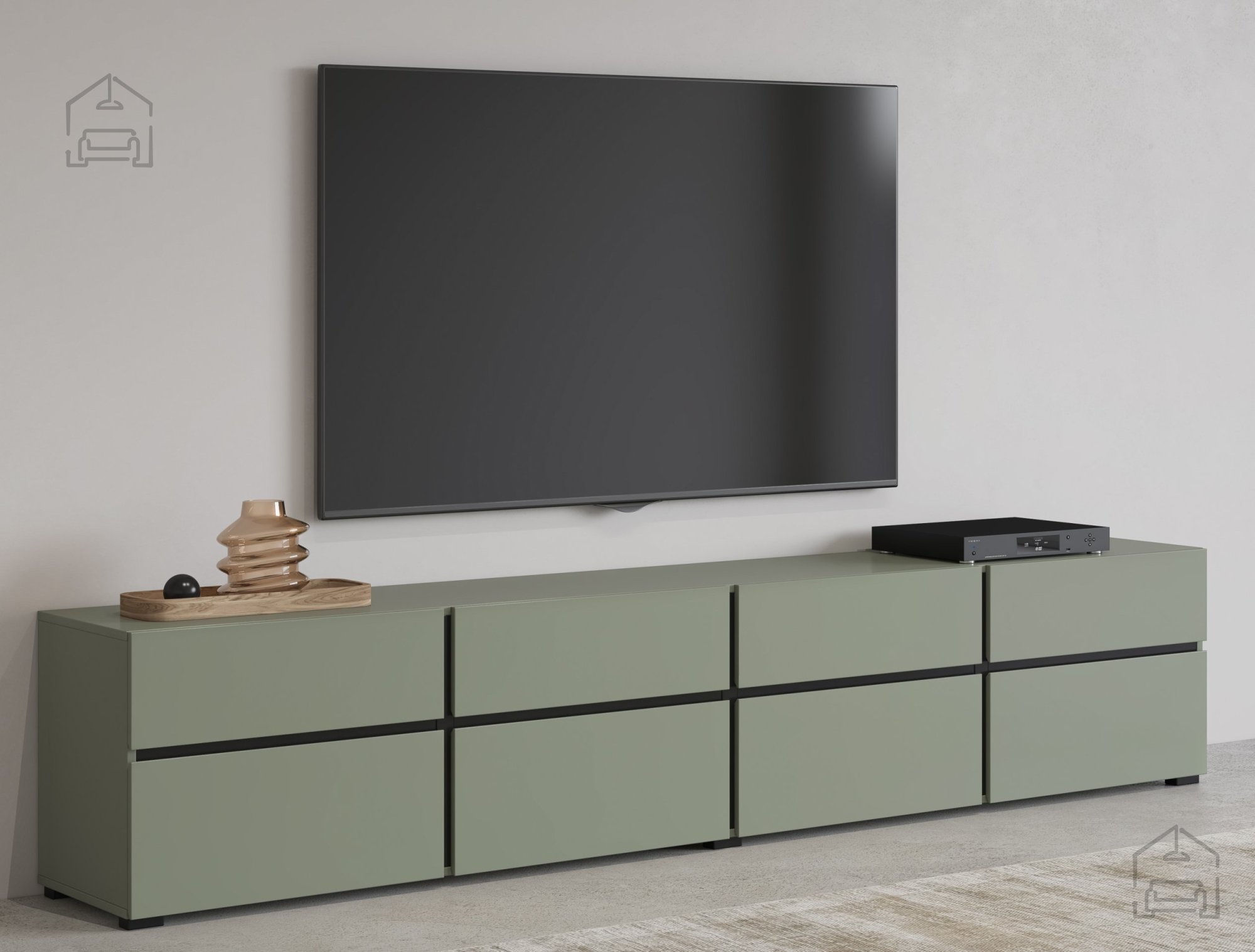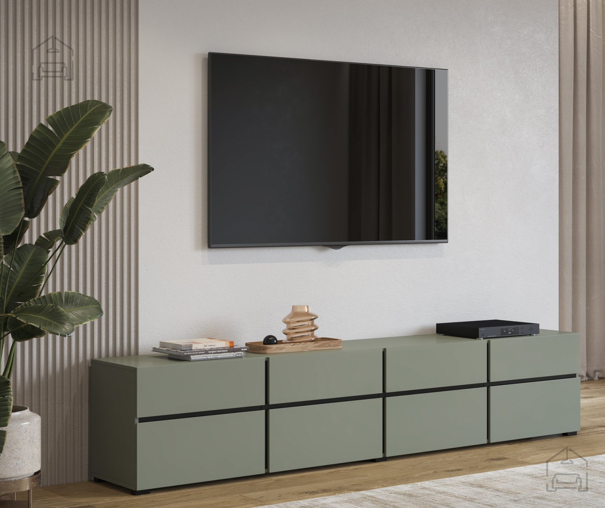 Entdecken Sie die perfekte Verbindung aus modernem Design und praktischer Funktionalität mit der TV-Kommode Cross in edlem Grün und kontrastierendem Grün-Schwarz. Dieses beeindruckende Möbelstück aus hochwertigem MDF ist ideal für alle, die im Wohnzimmer Wert auf Stil und Zweckmäßigkeit legen. Mit ihren großzügigen Maßen von 225x40x48 cm bietet sie ausreichend Platz für Ihren Fernseher, Unterhaltungselektronik und andere Utensilien.