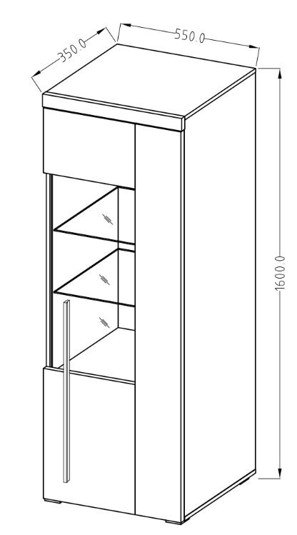 Mit den Maßen 55x35x160 cm passt diese Vitrine ideal in nahezu jeden Bereich Ihres Zuhauses – ob im Wohnzimmer, Esszimmer oder Flur. Sie besteht aus einer laminierten Platte, die für Langlebigkeit und Widerstandsfähigkeit im Alltag sorgt. Das Material ist bekannt für seine Robustheit und einfache Pflege, sodass die Vitrine Roger rechts ihren Glanz über viele Jahre hinweg behält.