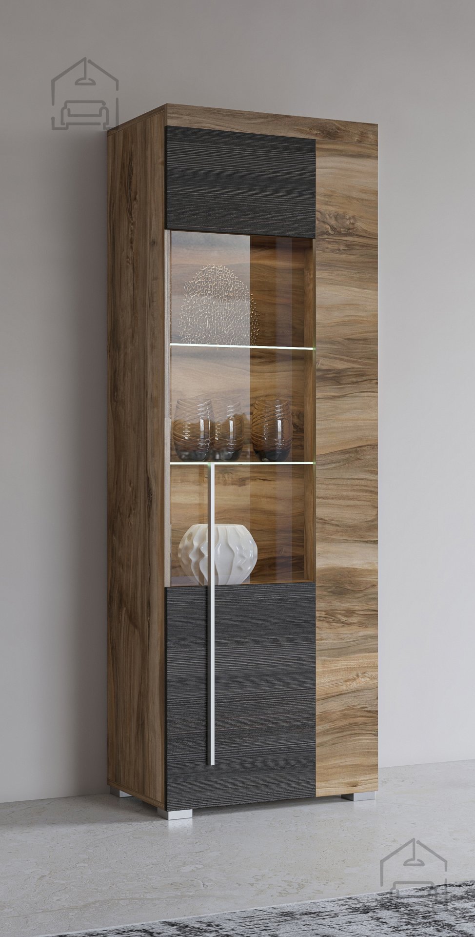 Die Vitrine präsentiert sich in einer stilvollen Kombination aus Nussbaum und dunkler Eiche, die sich harmonisch in verschiedenste Einrichtungsstile einfügt. Diese neutrale, aber zugleich elegante Farbgebung verleiht dem Raum Wärme und Behaglichkeit, ohne auf einen modernen Look zu verzichten. Besonders hervorzuheben sind die ABC-Kanten, die nicht nur optisch überzeugen, sondern auch für zusätzliche Stabilität und Sicherheit sorgen.