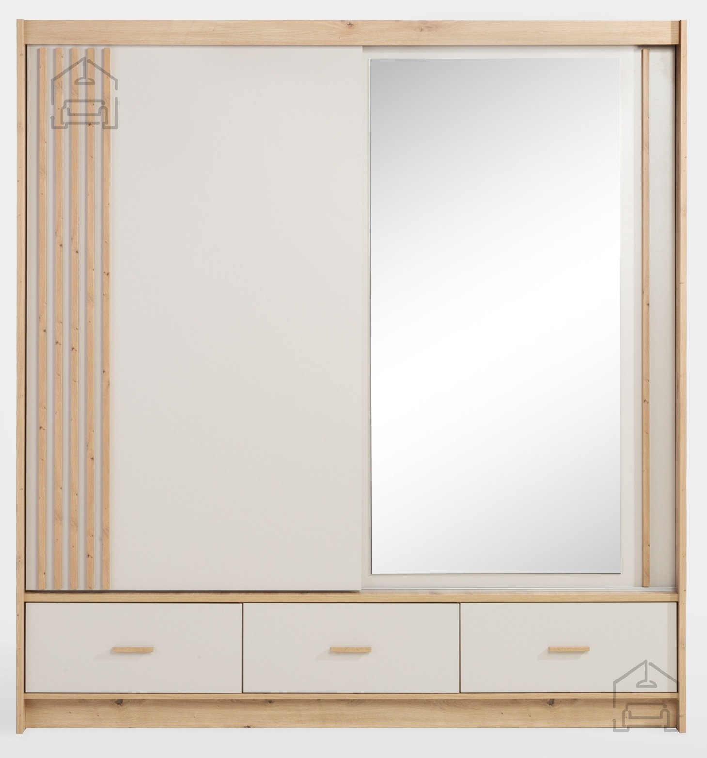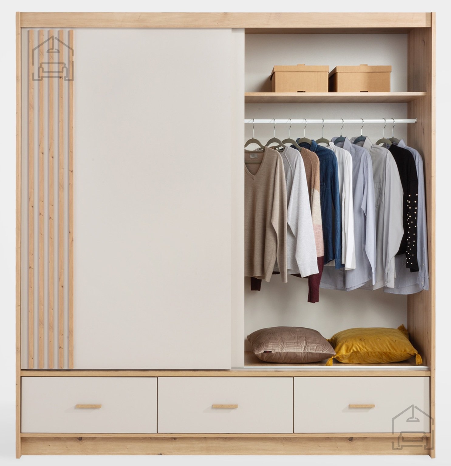 Die Schiebetüren sind eine ideale Lösung, um Platz zu sparen, da sie beim Öffnen keinen zusätzlichen Raum beanspruchen – besonders nützlich in kleineren Wohnungen. Außerdem verfügt der Schrank über zusätzliche Schubladen im unteren Bereich, die sich hervorragend zur Aufbewahrung von Accessoires, Kleidung oder Bettwäsche eignen.