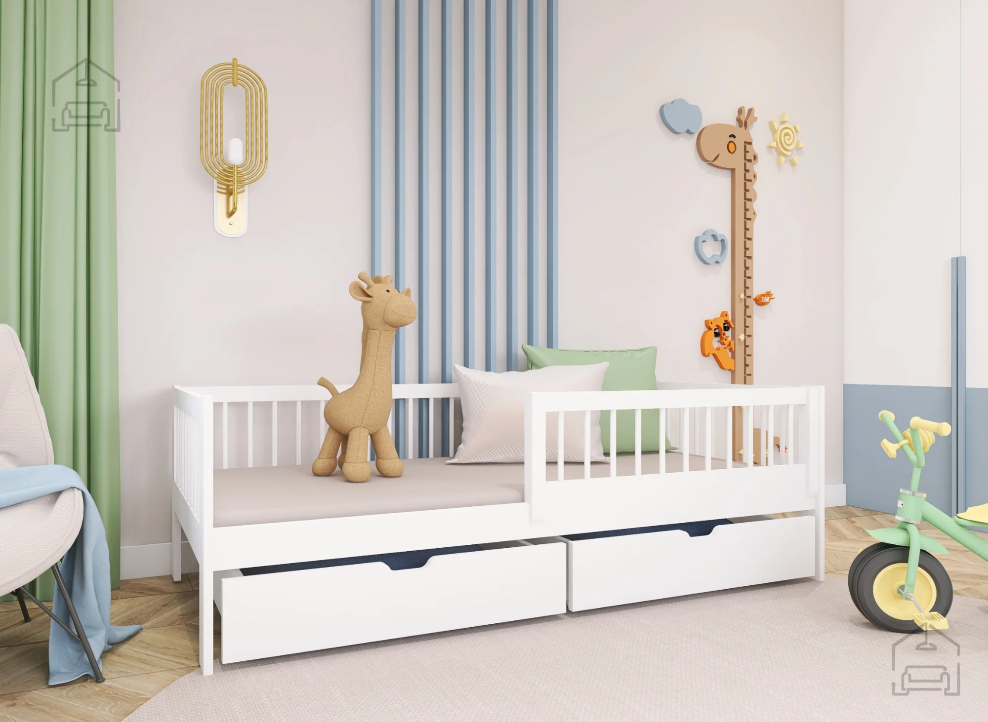 Das Kinderbett Edi bietet das perfekte Gleichgewicht zwischen Funktionalität, Ästhetik und Komfort. Seine weiße Farbe ermöglicht eine einfache Kombination mit verschiedenen Farbschemata des Kinderzimmers. Darüber hinaus gewährleisten hochwertige Materialien und Verarbeitung eine langfristige Nutzung, was bedeutet, dass das Bett Ihr Kind über viele Jahre begleiten wird. Neben dem ästhetischen Erscheinungsbild und der Langlebigkeit bieten zusätzliche Schubladen unter dem Bett eine optimale Aufbewahrungslösung, was oft ein entscheidender Punkt in Kinderzimmern ist, wo Platz immer knapp ist. Die abnehmbare Barriere ermöglicht es, das Bett leicht an die Bedürfnisse Ihres Kindes anzupassen, was ein zusätzlicher Vorteil für Eltern ist, die praktische Lösungen wünschen. Wenn Sie ein Bett suchen, das Funktionalität, Eleganz und Qualität vereint, ist das Kinderbett Edi die richtige Wahl für Sie. Es wird nicht nur den Bedürfnissen Ihres Kindes gerecht, sondern auch eine außergewöhnliche Ergänzung zum Gesamtbild des Zimmers sein.