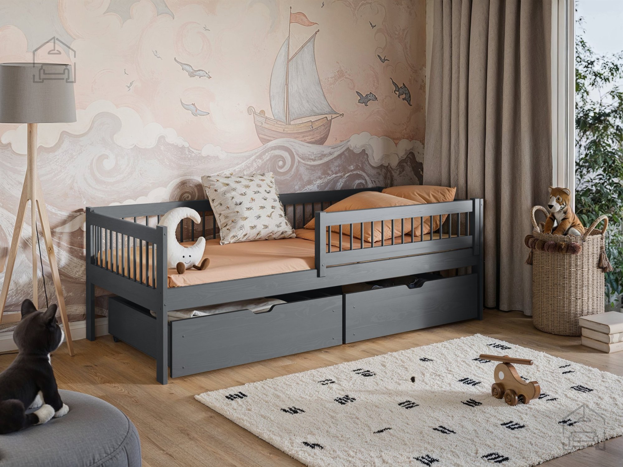 Elegantna grafitna barva postelje se zlahka prilagodi različnim notranjim stilom in barvnim shemam. Ta nevtralna, a sodobna barva omogoča enostavno kombiniranje z drugimi pohištvenimi elementi in dodatki, ustvarja pa tudi prijeten in pomirjujoč ambient v otroški sobi.