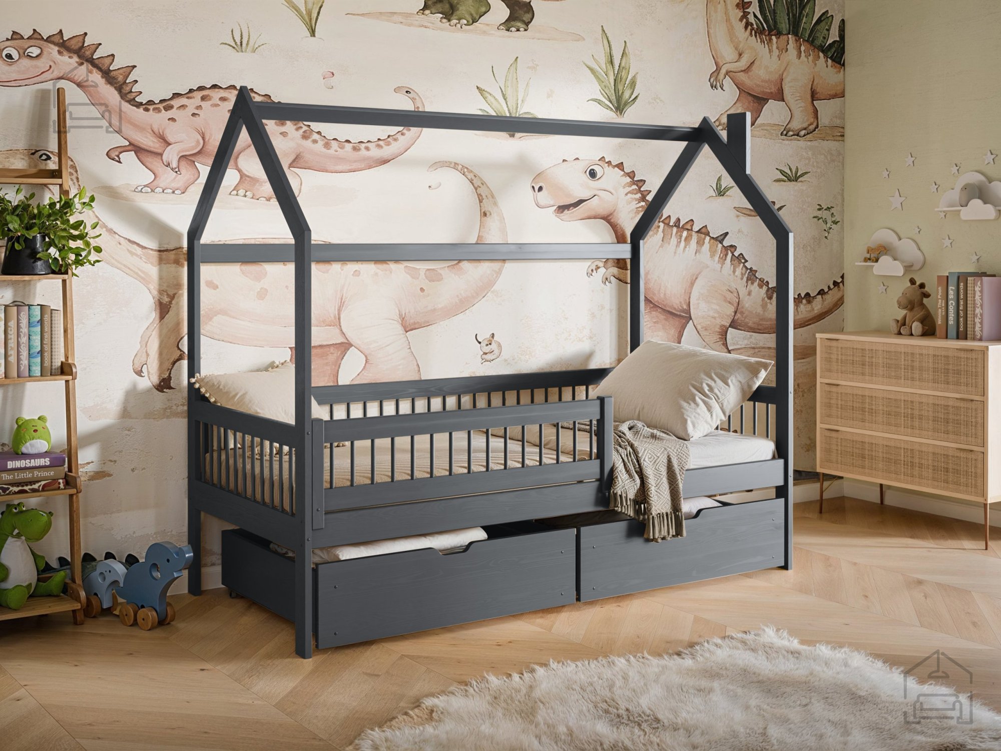 Hergestellt aus hochwertigem Kiefernholz, bietet das Bett Oskar die Stärke und Haltbarkeit, die Sie im Kinderzimmer benötigen. Mit einer Tragfähigkeit von bis zu 100 kg ist es so konzipiert, dass es mit Ihrem Kind mitwächst. Darüber hinaus ist es mit seiner graphitfarbenen Oberfläche elegant und lässt sich leicht mit verschiedenen Einrichtungsstilen kombinieren.