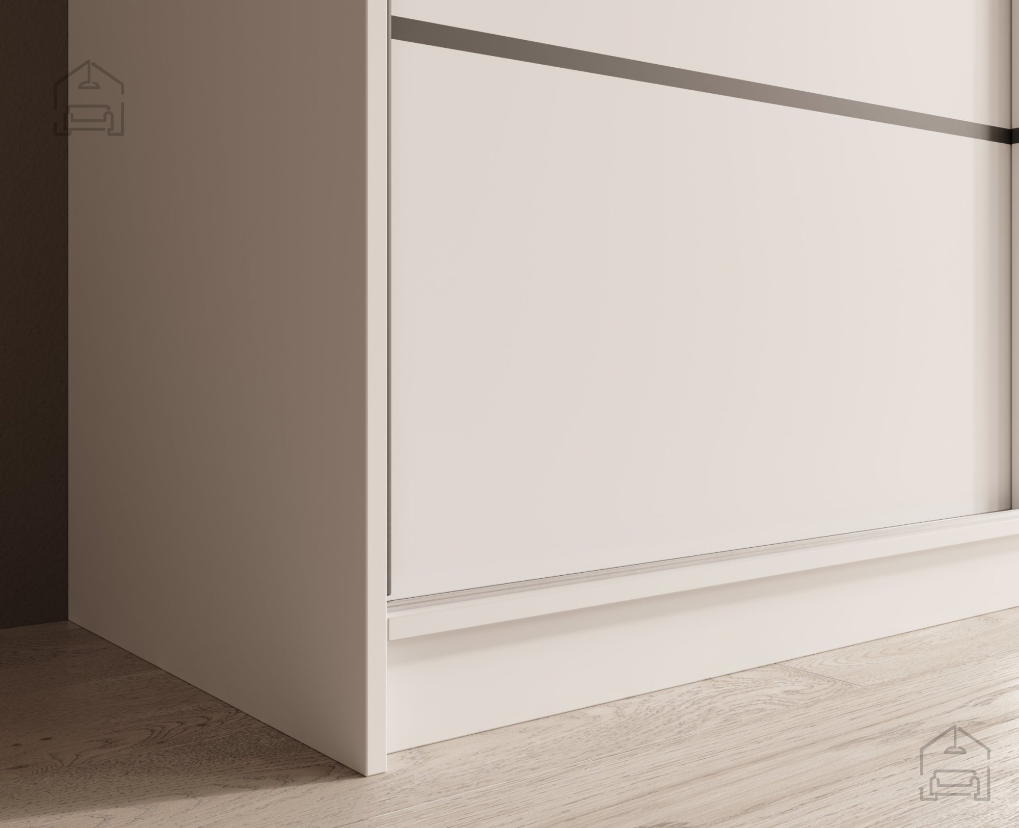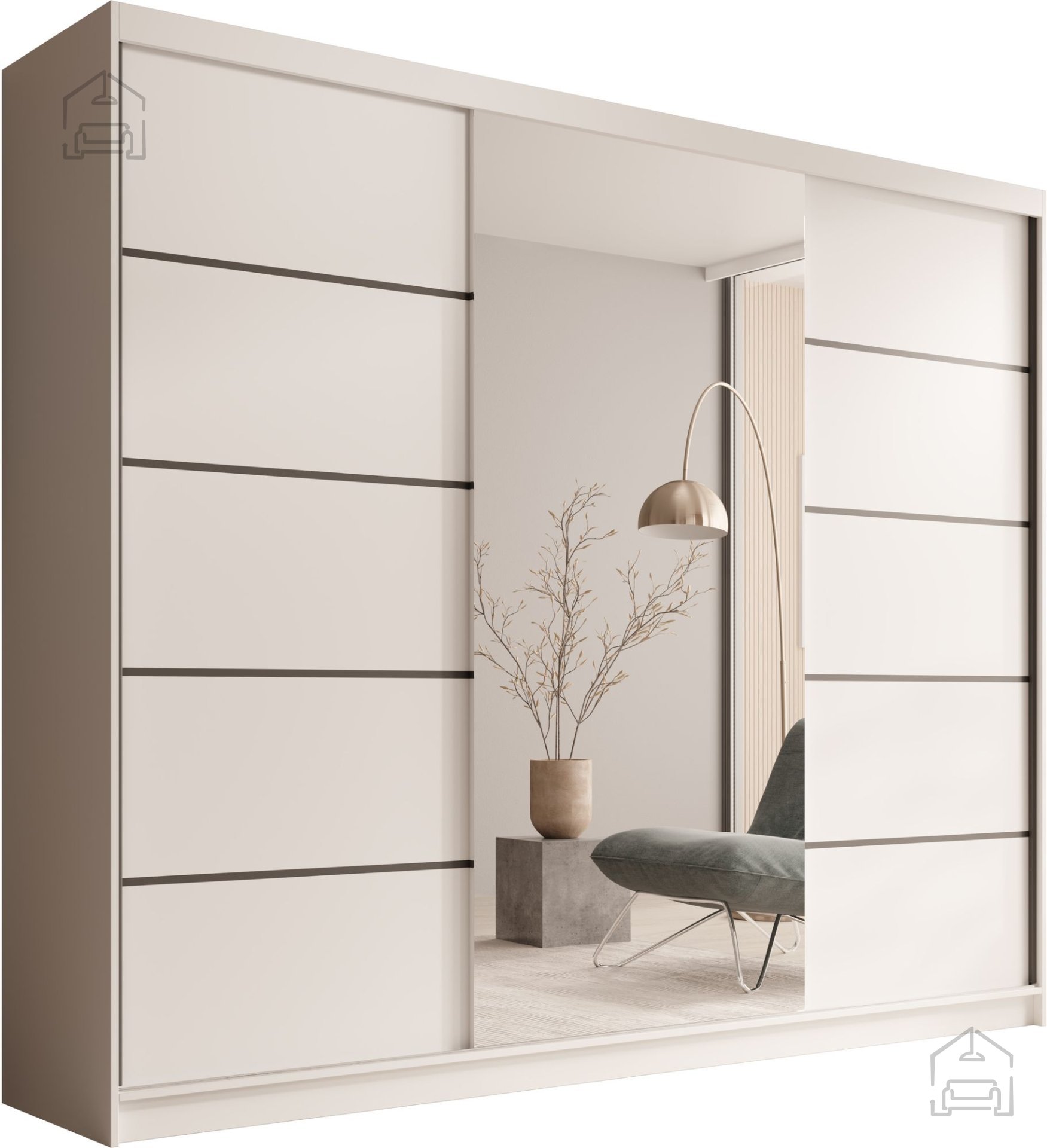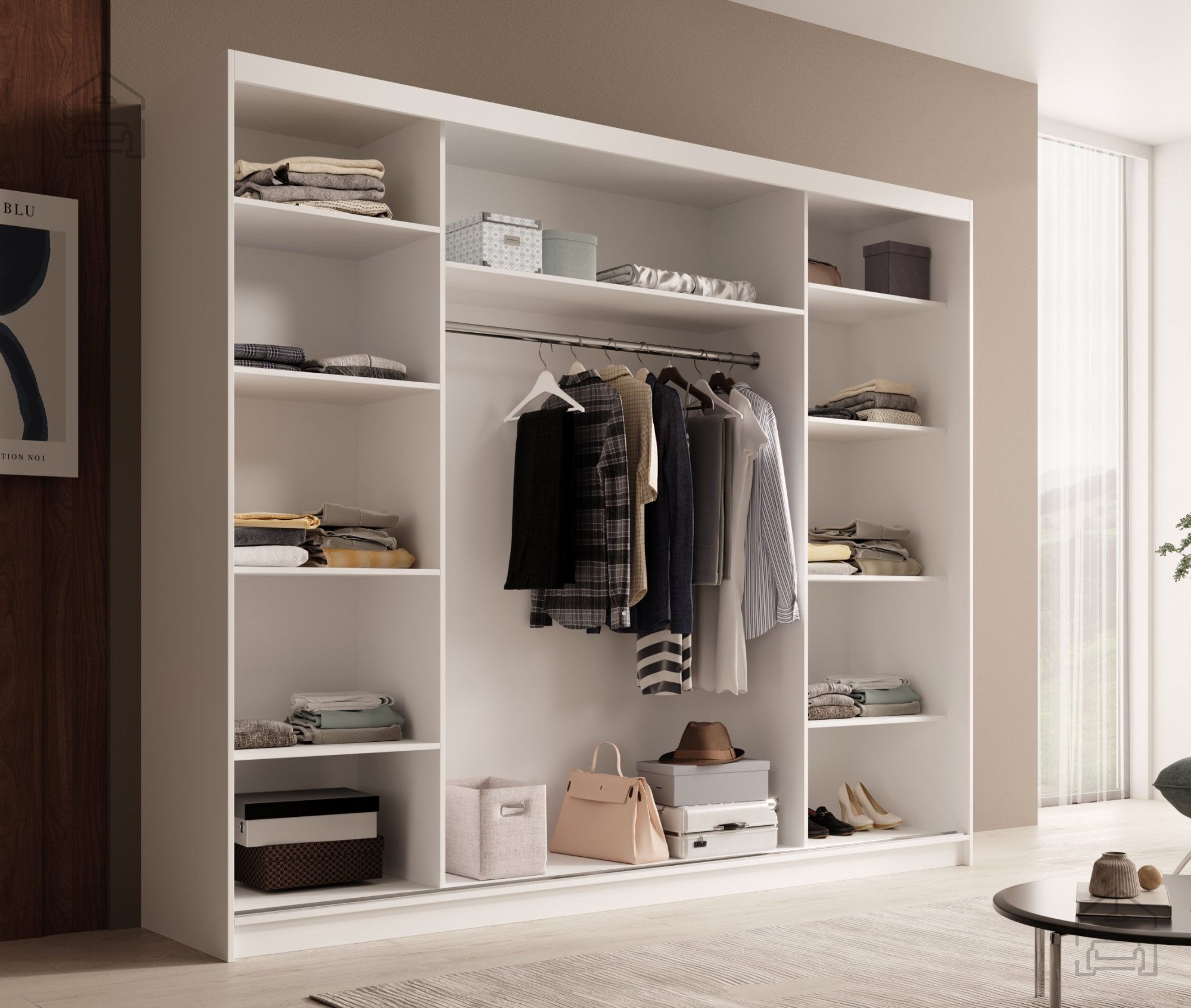 Der Schrank ist so gestaltet, dass er auch den Ansprüchen anspruchsvollerer Nutzer gerecht wird. Innen finden Sie mehrere Ablagefächer und einen Kleiderbereich, die eine übersichtliche Aufbewahrung von Kleidung, Schuhen und Accessoires ermöglichen. Die Schiebetüren lassen sich leicht öffnen und benötigen keinen zusätzlichen Platz für Flügeltüren – eine clevere Lösung für kleinere Schlafzimmer, Vorzimmer oder Ankleideräume. Dank der gut durchdachten Aufteilung bleibt alles ordentlich und griffbereit.
