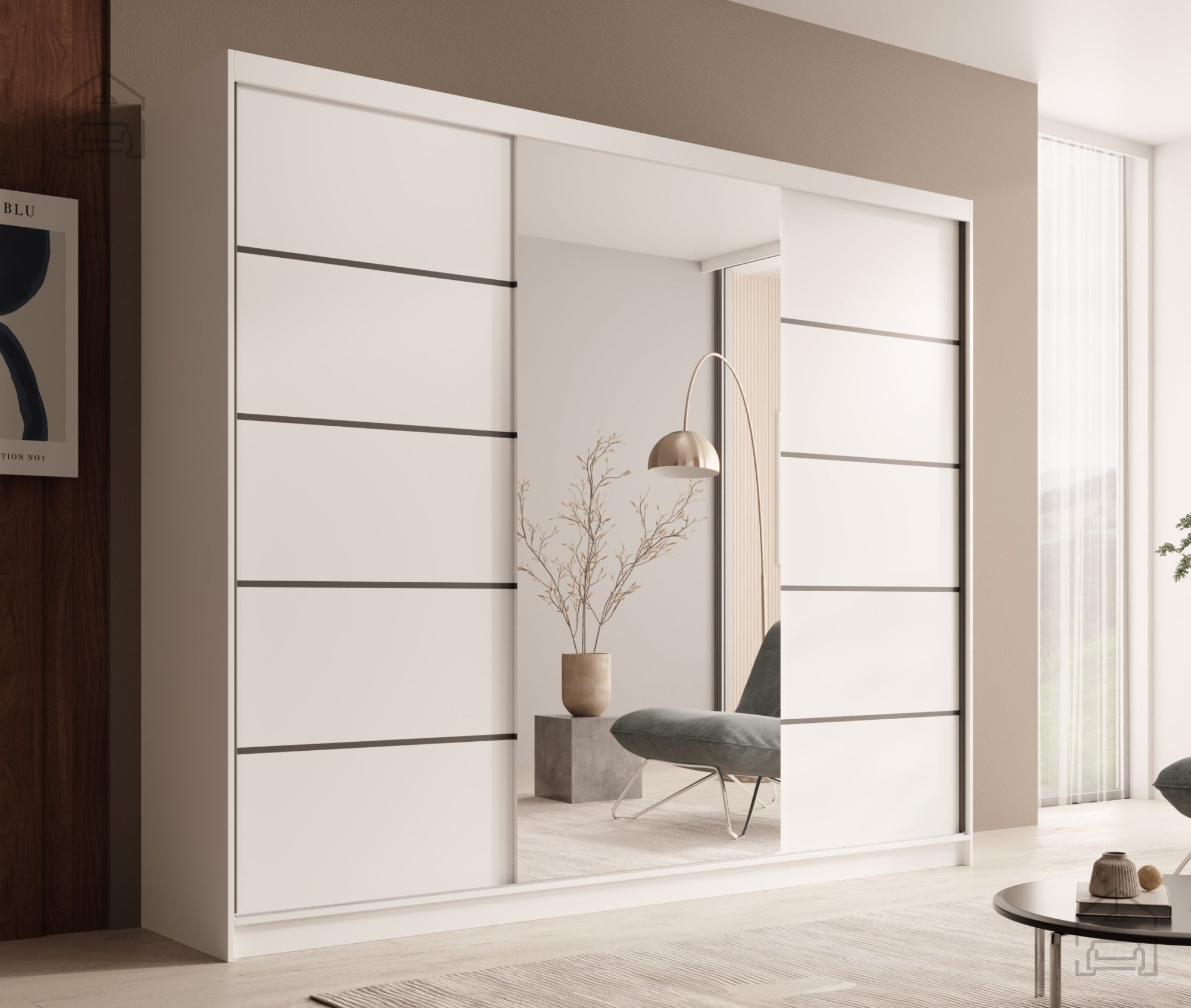 Bringen Sie Ordnung, Eleganz und praktische Funktionalität in Ihr Zuhause mit einem modernen Kleiderschrank, der zeitloses Design und durchdachte Konstruktion vereint. Mit den Maßen 250x58x215 cm bietet er großzügigen Stauraum und lässt dank seiner weißen Farbe und der großen Spiegelfront den Raum optisch größer und heller wirken. Ein Möbelstück, das alle begeistert, die Wert auf Funktionalität, Ästhetik und Qualität legen.
