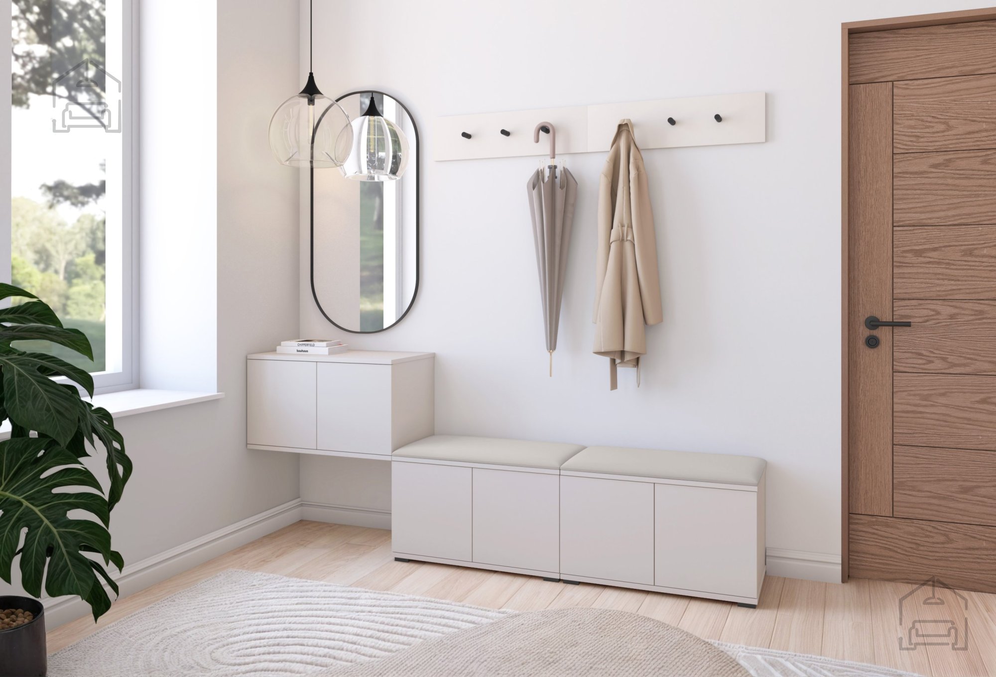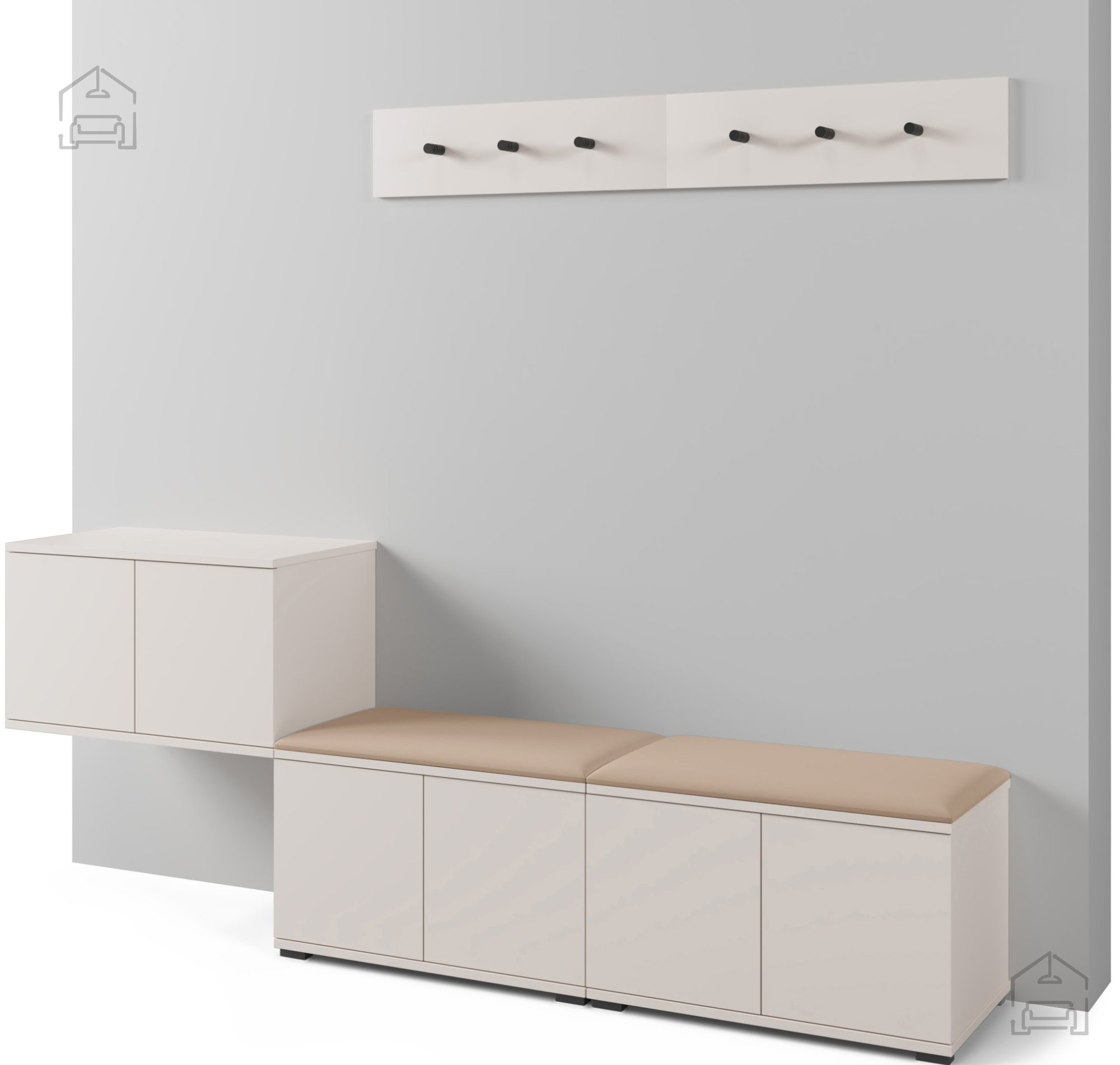 Vielseitige Funktionalität: Das Set beinhaltet einen Schuhschrank und einen Hängeschrank, die beide mit einem „Push-to-open“-System ausgestattet sind. Diese innovative Funktion ermöglicht ein einfaches und elegantes Öffnen ohne Griffe, was ein sauberes und elegantes Erscheinungsbild bewahrt.