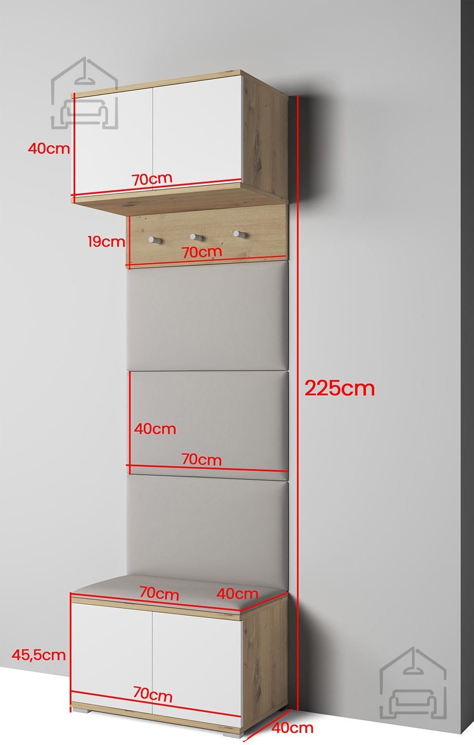 Das Set ist aus laminierter Platte mit einer Stärke von 16 mm gefertigt, was Haltbarkeit und eine lange Lebensdauer gewährleistet. Die Farbe Artisan Eiche bringt Wärme und natürliche Schönheit, die sich harmonisch mit verschiedenen Einrichtungsstilen verbindet. Die Polsterung aus dem Stoff Trinity 22 verleiht einen Hauch von Weichheit und Komfort, wodurch Ihr Flur nicht nur funktional, sondern auch ein angenehmer Raum zum Empfang von Gästen wird.