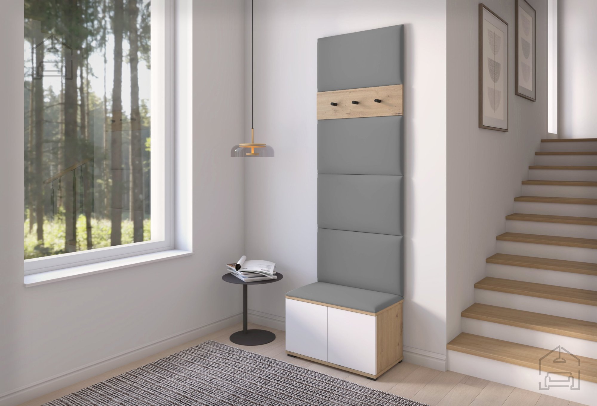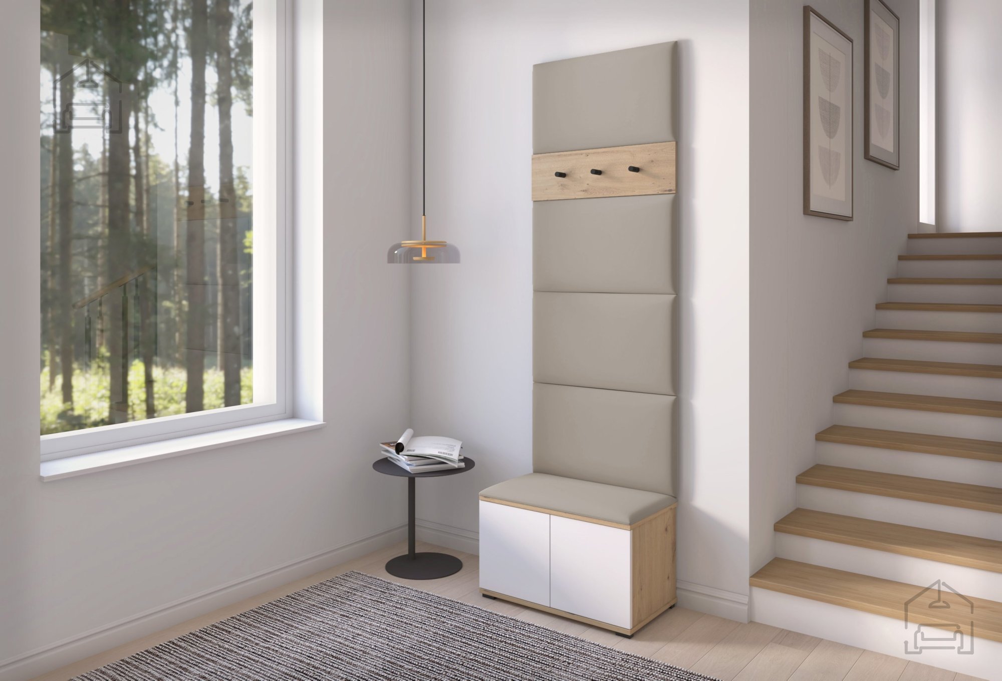 - Kleiderhakenleiste: in Eiche Artisan mit 3 Metallhaken, für bequemes Aufhängen von Kleidung.