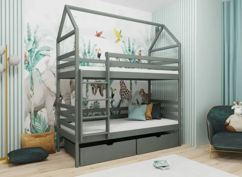 Wählen Sie das Etagenbett Alex - 80x160 cm in Graphitfarbe für eine optimale Kombination aus Funktionalität, Stil und Langlebigkeit. Hergestellt aus hochwertigem Kiefernholz, mit fester Trennwand und zusätzlichen Schubladen, bringt dieses Etagenbett alles, was Sie für ein ordentliches und ästhetisch ansprechendes Zimmer benötigen. Verpassen Sie nicht die Gelegenheit, Ihr Zuhause mit einem einzigartigen Möbelstück zu bereichern, das sowohl Sie als auch Ihre Kleinen begeistern wird. Beeilen Sie sich und bestellen Sie Ihr Etagenbett Alex noch heute!