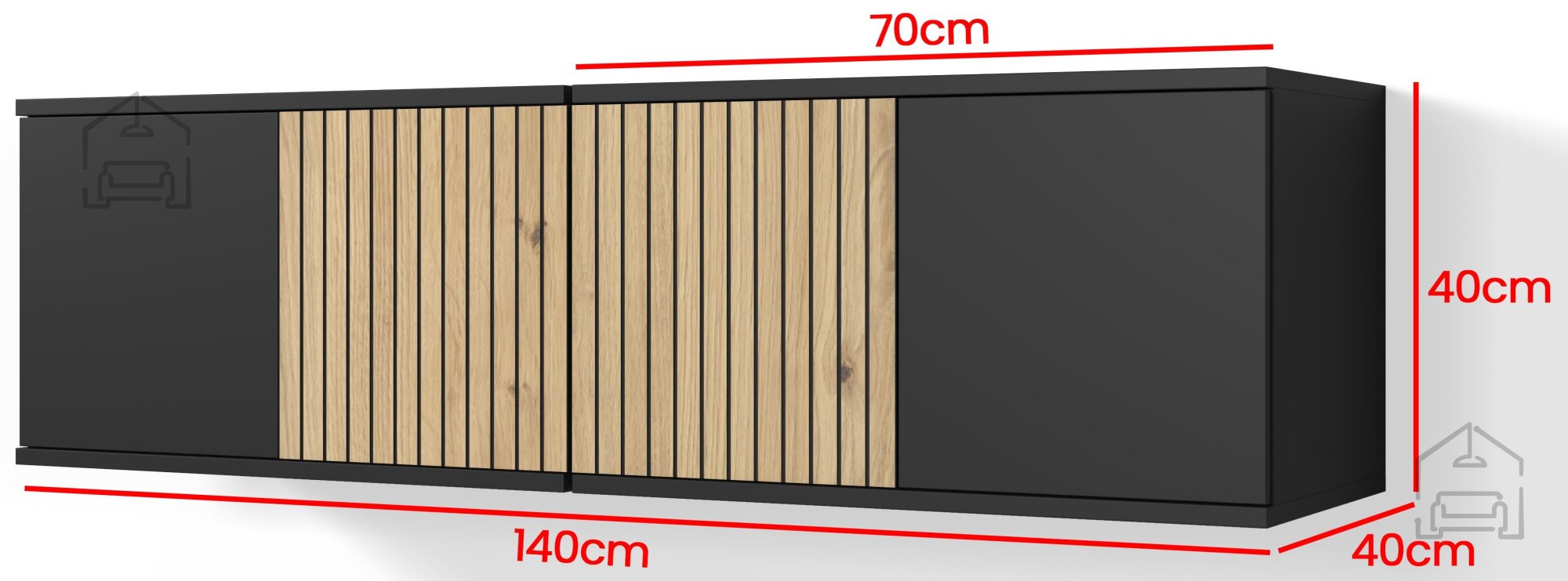 Wir präsentieren Ihnen die Wand-TV-Kommode Ross 140 cm, die modernes Design und Praktikabilität vereint und so zum Mittelpunkt Ihres Wohnzimmers wird. Mit ihrer eleganten Kombination aus schwarzer Farbe und Eiche Artisan wird sie alle Liebhaber moderner Innenarchitektur begeistern. Hergestellt aus einer hochwertigen laminierten Platte mit einer Stärke von 16 mm, garantiert diese Kommode Haltbarkeit und eine lange Lebensdauer.