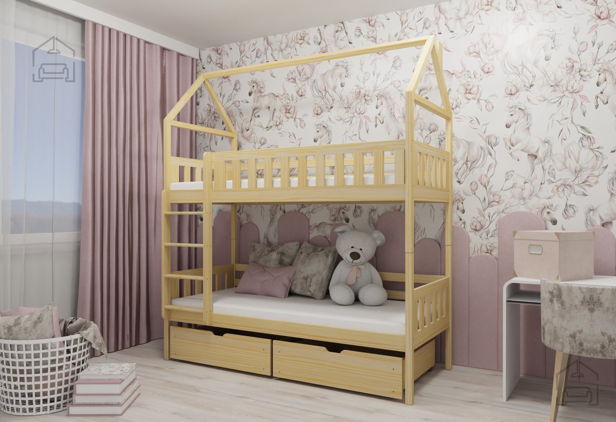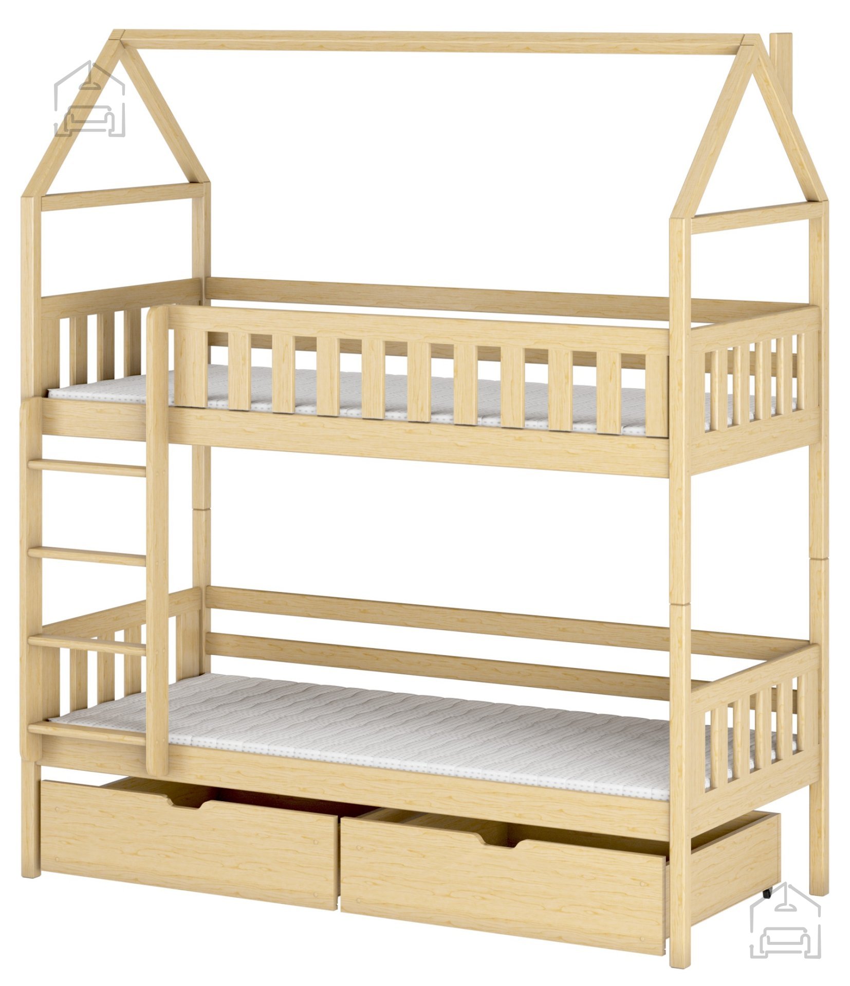 - Stauraum: Das Etagenbett enthält zwei praktische Schubladen, die zusätzlichen Platz für Bettwäsche, Spielzeug oder Kleidung bieten.