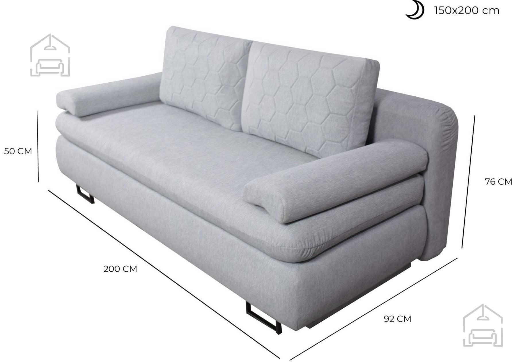 Der Zweisitzer verfügt über einen fortschrittlichen Euro-Mechanismus, der eine einfache Umwandlung der Sitzgarnitur in ein bequemes Bett mit einer Liegefläche von 150x200 cm ermöglicht. Dies ist die ideale Lösung für Gäste, die bei Ihnen übernachten, oder für jene Momente, in denen Sie sich einen Nachmittagsschlaf gönnen möchten. Die Sitzhöhe von 50 cm ist optimal für bequemes Sitzen, ohne Ihre Gelenke zu belasten. Die Zusammensetzung des Zweisitzers umfasst einen Bonell-Federkern, der hervorragende Unterstützung und Langlebigkeit garantiert. Der Rahmen aus hochwertigem Holz verleiht Stabilität und Robustheit, was bedeutet, dass der Zweisitzer Tori viele Jahre als zentrales Möbelstück Ihres Zuhauses dienen wird. Zusätzliche Funktionalität bietet die Bettkasten-Schublade, die praktisches Verstauen und zusätzliche Organisation Ihres Zuhauses ermöglicht.