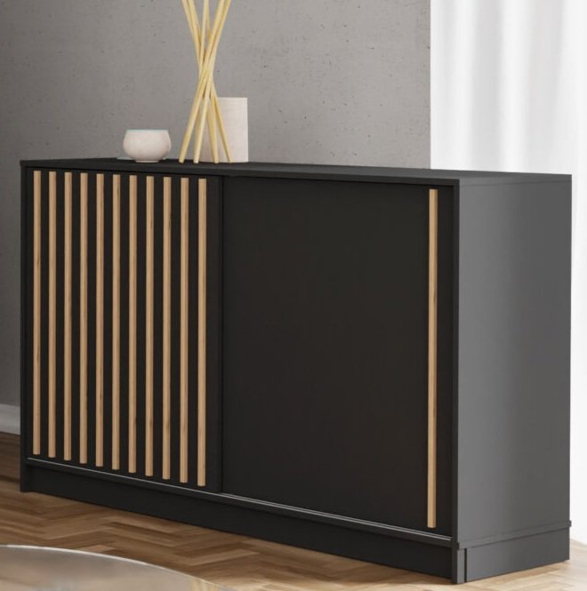 Entdecken Sie die wunderschöne Kommode Royal, die zeitlose Eleganz mit durchdachter Funktionalität vereint – ideal für Ihr modernes Zuhause. Mit den Maßen 150x45x94 cm ist sie die perfekte Wahl für jeden Raum, der Stil und praktische Nutzung miteinander verbinden soll. Gefertigt aus hochwertiger Spanplatte in einer eleganten Kombination aus Schwarz und Wotan-Eiche bietet diese Kommode nicht nur ein ansprechendes Design, sondern auch hohe Langlebigkeit.