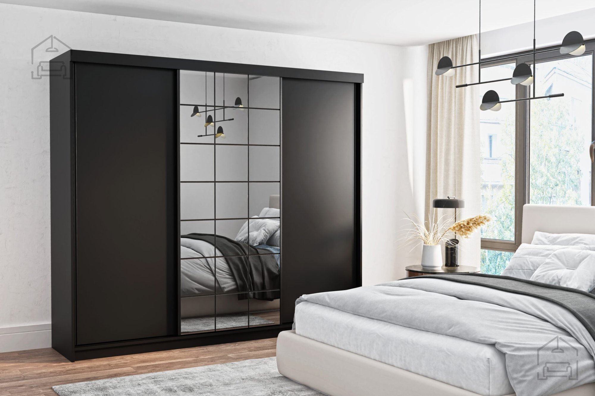 Mit seinen Maßen von 250x62x216 cm bietet der Kleiderschrank Collin reichlich Platz für Kleidung, Schuhe und Accessoires. Die Schiebetüren ermöglichen einen bequemen Zugriff auf den Inhalt, ohne zusätzlichen Raum zu beanspruchen – ideal für kleinere Zimmer. Der Spiegel an der Tür lässt den Raum optisch größer wirken und ist perfekt, um vor dem Hinausgehen noch rasch den Look zu überprüfen.