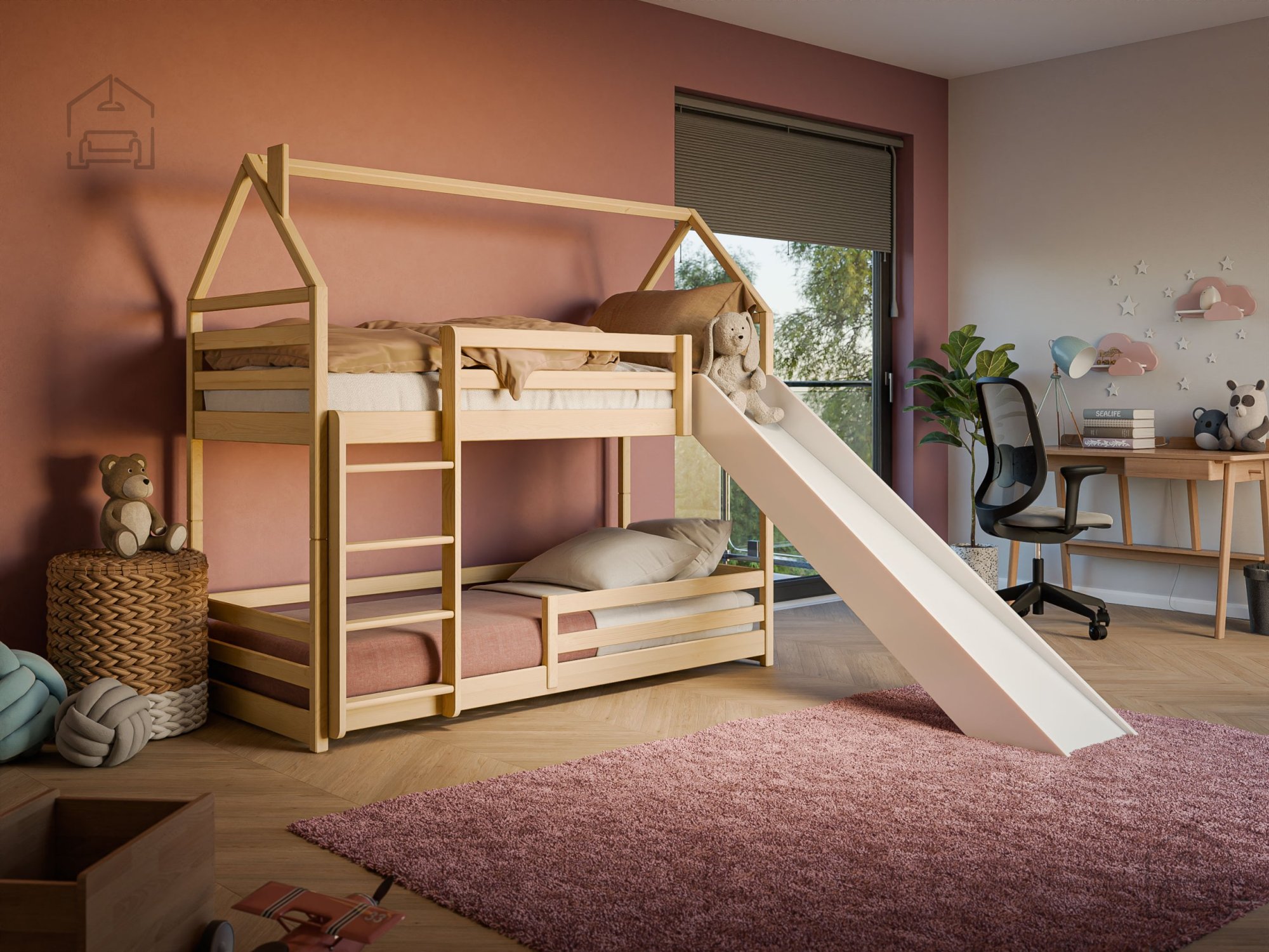 Erstens ist das Etagenbett mit Rutsche Play aus robustem Kiefernholz gefertigt, das Haltbarkeit und eine lange Lebensdauer gewährleistet. Jedes Bett hat eine Tragfähigkeit von bis zu 100 kg, was bedeutet, dass es stark genug für Kinder jeden Alters ist. Keine Sorge um die Sicherheit der Kleinsten – die feste Umrandung sorgt für sicheres Schlafen ohne Stürze. Zweitens bietet dieses Etagenbett mehr als nur einen Schlafplatz. Die Rutsche ist eine hervorragende Ergänzung, die das Spielen der Kinder auf ein neues Niveau hebt. Ihre Kinder werden es genießen, hinunterzurutschen, was ihre Fantasie und Kreativität anregt. Außerdem kann die Rutsche leicht entfernt werden, wenn Sie sie nicht benötigen. Drittens ist die Flexibilität ein wesentlicher Vorteil dieses Etagenbettes. Es kann in zwei separate Betten geteilt werden, was bedeutet, dass es sich den wechselnden Bedürfnissen Ihrer Familie anpasst. Dies ist eine ausgezeichnete Lösung für diejenigen, die Platz sparen möchten und gleichzeitig Anpassungsmöglichkeiten für die Zukunft behalten wollen.