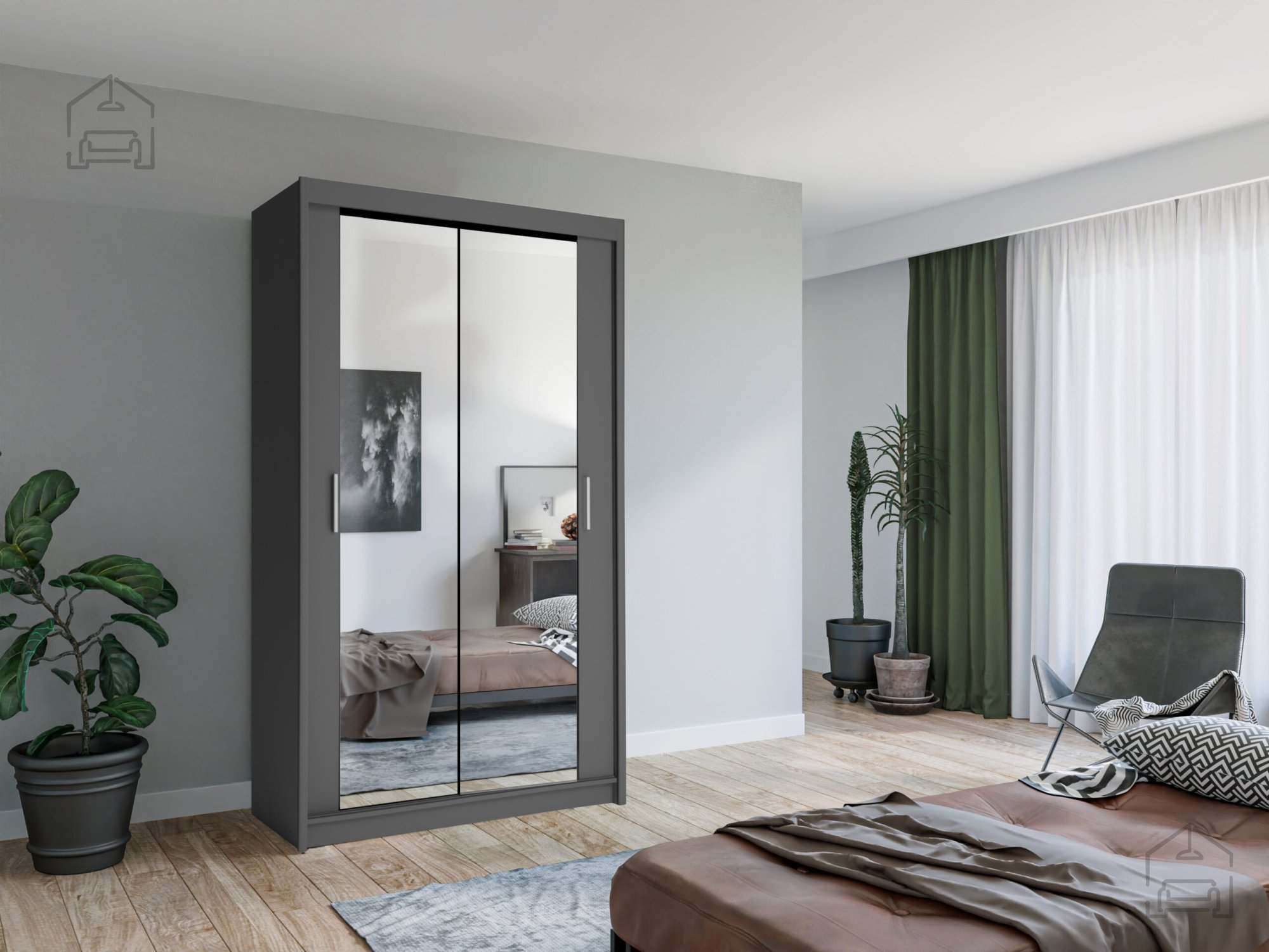 Der Kleiderschrank Lux 120 cm in edlem Grau ist die perfekte Wahl für alle, die Funktionalität und modernes Design verbinden möchten. Gefertigt aus hochwertiger Spanplatte und mit einem Spiegel ausgestattet, verleiht dieser Schrank Ihrem Schlafzimmer oder Vorraum nicht nur einen Hauch von Stil, sondern nutzt den vorhandenen Platz auch optimal, um Kleidung und Accessoires übersichtlich zu verstauen.