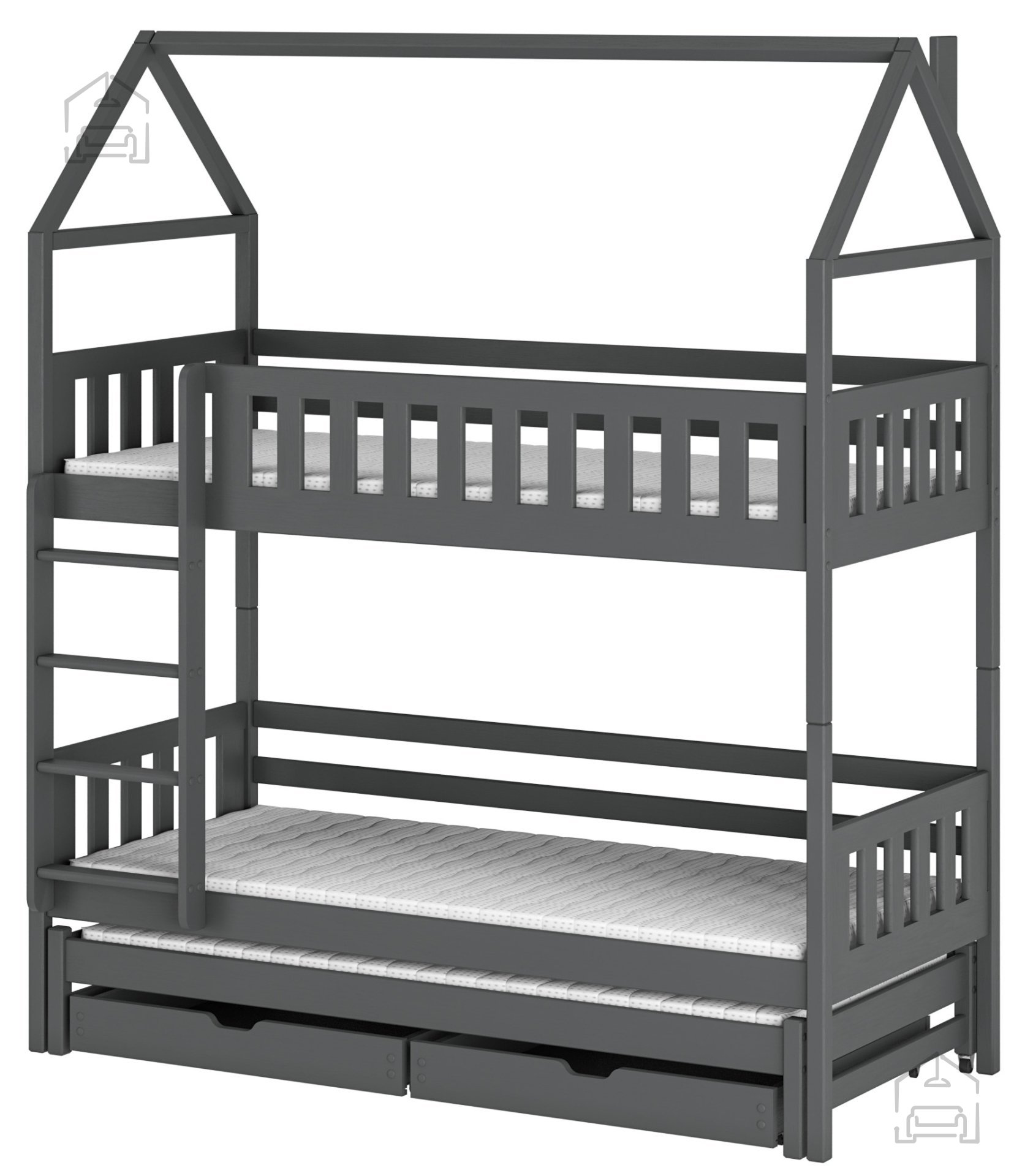Fiksna pregrada, ki jo je mogoče odstraniti, ponuja dodatno varnost med spanjem, hkrati pa prilagodljivost glede na potrebe vaših otrok. Če se bo družina povečala ali potrebujejo ločena ležišča, se pograd zlahka razdeli na dve posamezni postelji, kar omogoča brezskrbno preoblikovanje prostora. Grafit barva se enostavno kombinira z različnimi dekorji in je primerna za otroke ali mladostnike.