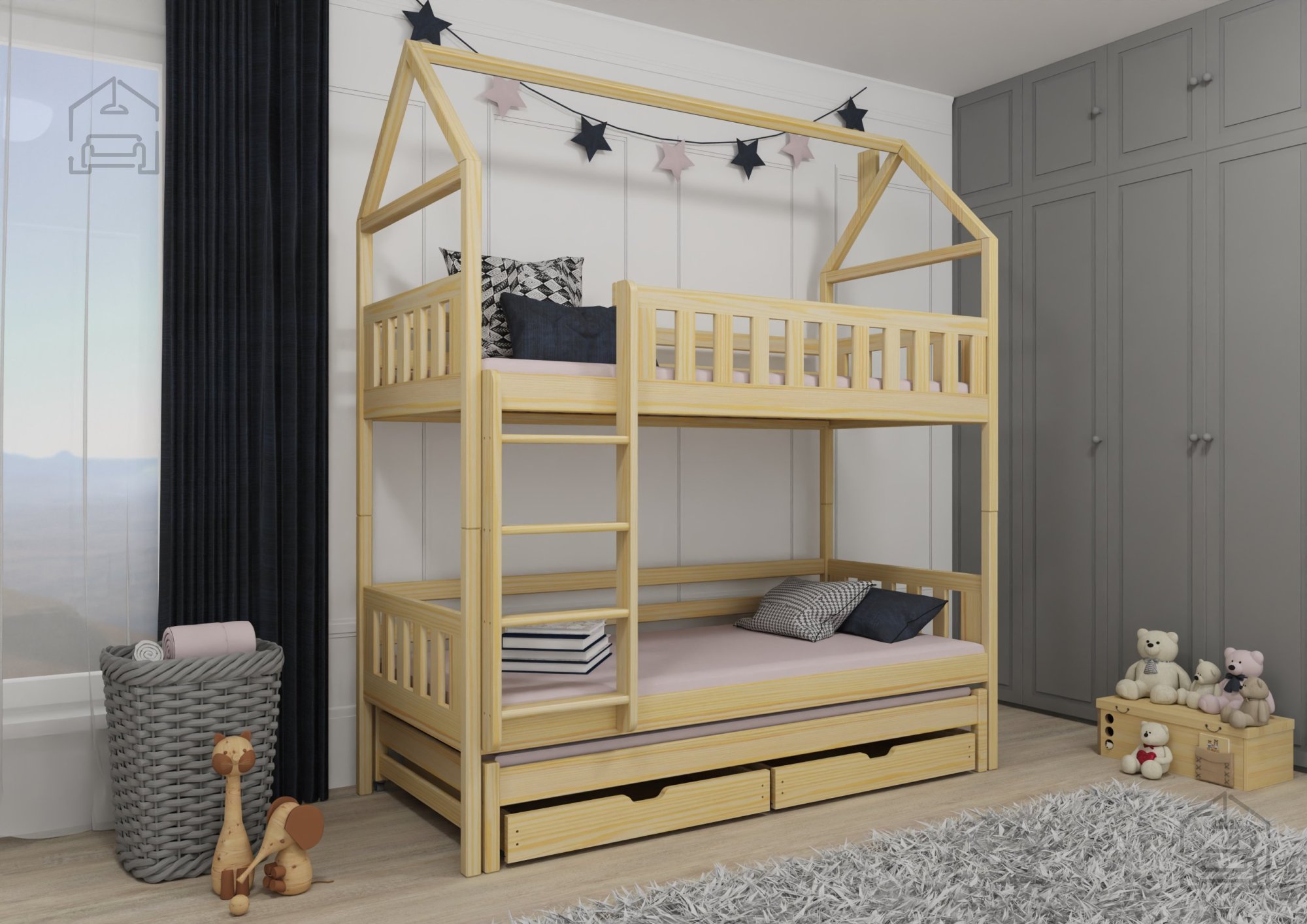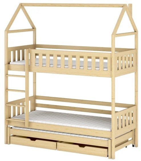 Mit dem Kauf des Etagenbetts Iga wählen Sie hochwertige Verarbeitung, Funktionalität und ästhetische Attraktivität. Seine Vielseitigkeit und Anpassungsfähigkeit gewährleisten, dass das Bett Ihrer Familie in verschiedenen Lebensphasen dient. Egal, ob Sie eine Lösung für ein kleines Zimmer suchen oder jeden Winkel des Raums optimal nutzen möchten – Iga ist eine ausgezeichnete Wahl. Verpassen Sie nicht die Gelegenheit, Ihrem Zuhause ein Möbelstück hinzuzufügen, das Praktikabilität und Eleganz vereint. Beeilen Sie sich und wählen Sie das Etagenbett mit zusätzlichem Bett Iga, wo sich Funktionalität und Schönheit treffen.