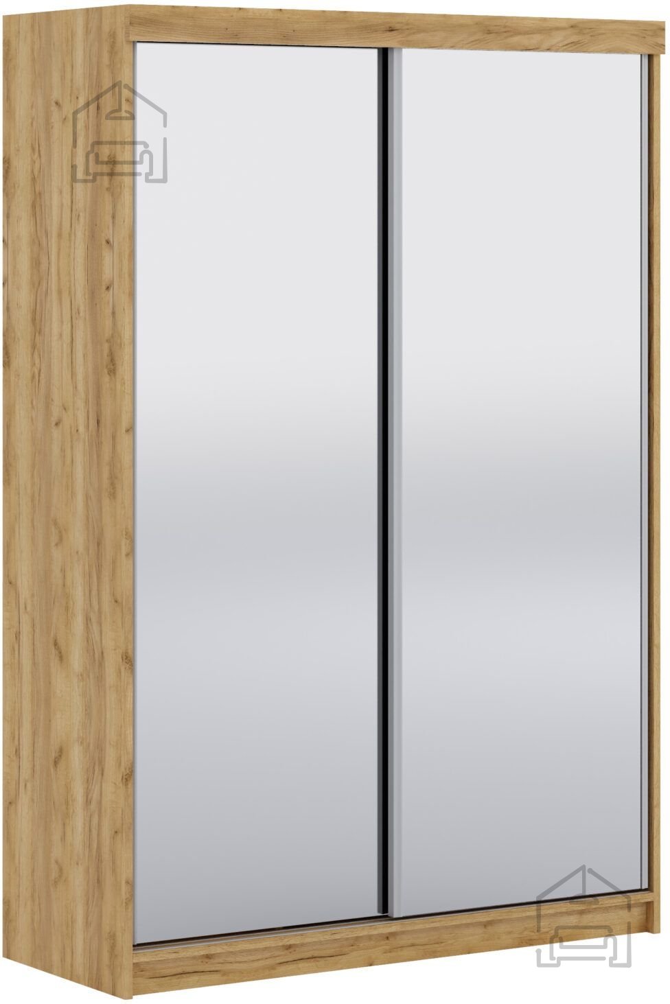 Der Kleiderschrank Pola mit zwei Spiegeln ist die ideale Wahl für alle, die Stil und praktische Nutzung in ihrem Zuhause verbinden möchten. Dieses wunderschöne Möbelstück aus hochwertiger Spanplatte in der Farbe Gold-Eiche bringt eine natürliche und warme Atmosphäre in jeden Raum. Mit den Maßen 150x62x200 cm bietet er großzügigen Stauraum, während die doppelte Spiegelfront den Raum optisch vergrößert und das tägliche Ankleiden erleichtert.