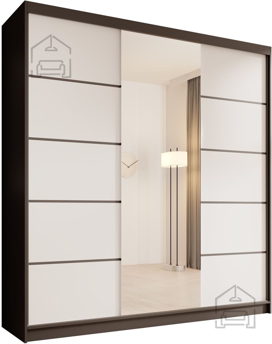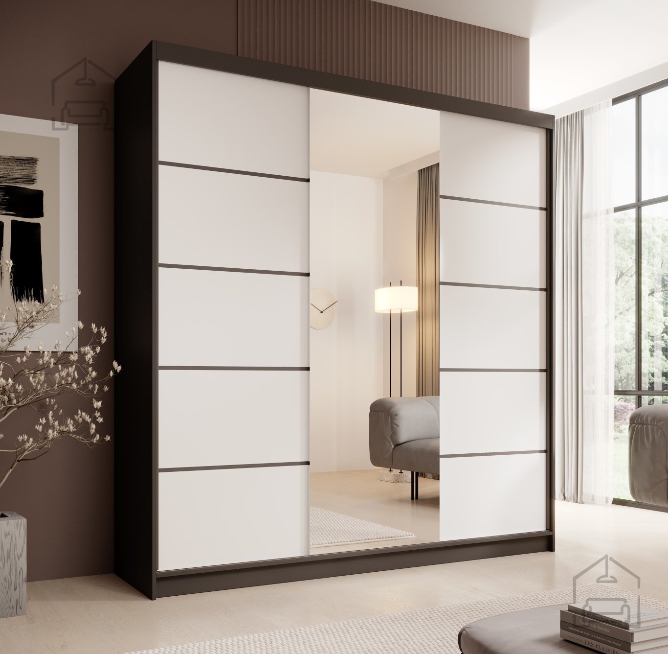 Die perfekte Kombination aus modernem Design, Funktionalität und großzügigem Stauraum – dieser Kleiderschrank mit Schiebetüren wird rasch zu einem unverzichtbaren Möbelstück in Ihrem Zuhause. Mit seiner eleganten Schwarz-Weiß-Farbkombination passt er sowohl zu einem minimalistischen als auch zu einem klassisch eingerichteten Raum und bietet dabei jede Menge Platz für Kleidung, Schuhe und Accessoires.