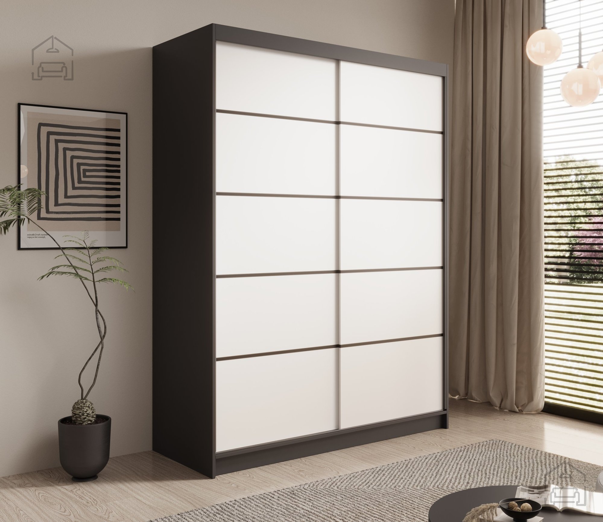 Der Kleiderschrank Calma 150 ist mehr als nur ein Möbelstück – er ist eine Investition in ein gut organisiertes und stilvolles Zuhause. Er bietet reichlich Stauraum für Kleidung, Schuhe und Accessoires und hilft Ihnen, Ordnung und Übersicht zu bewahren. Mit seinen eleganten Schiebetüren sparen Sie nicht nur Platz, sondern verleihen Ihrem Zuhause auch eine ansprechende Optik.