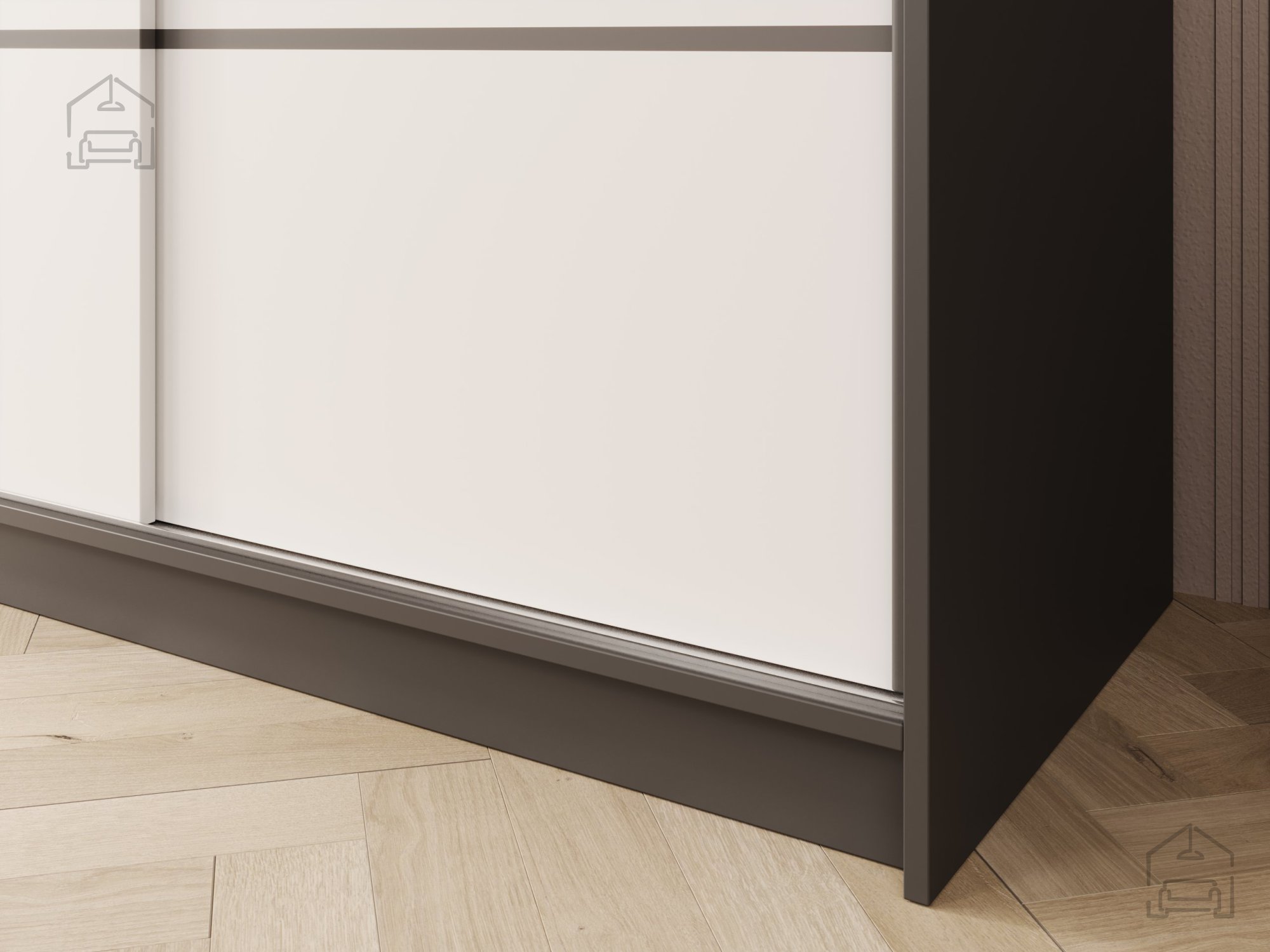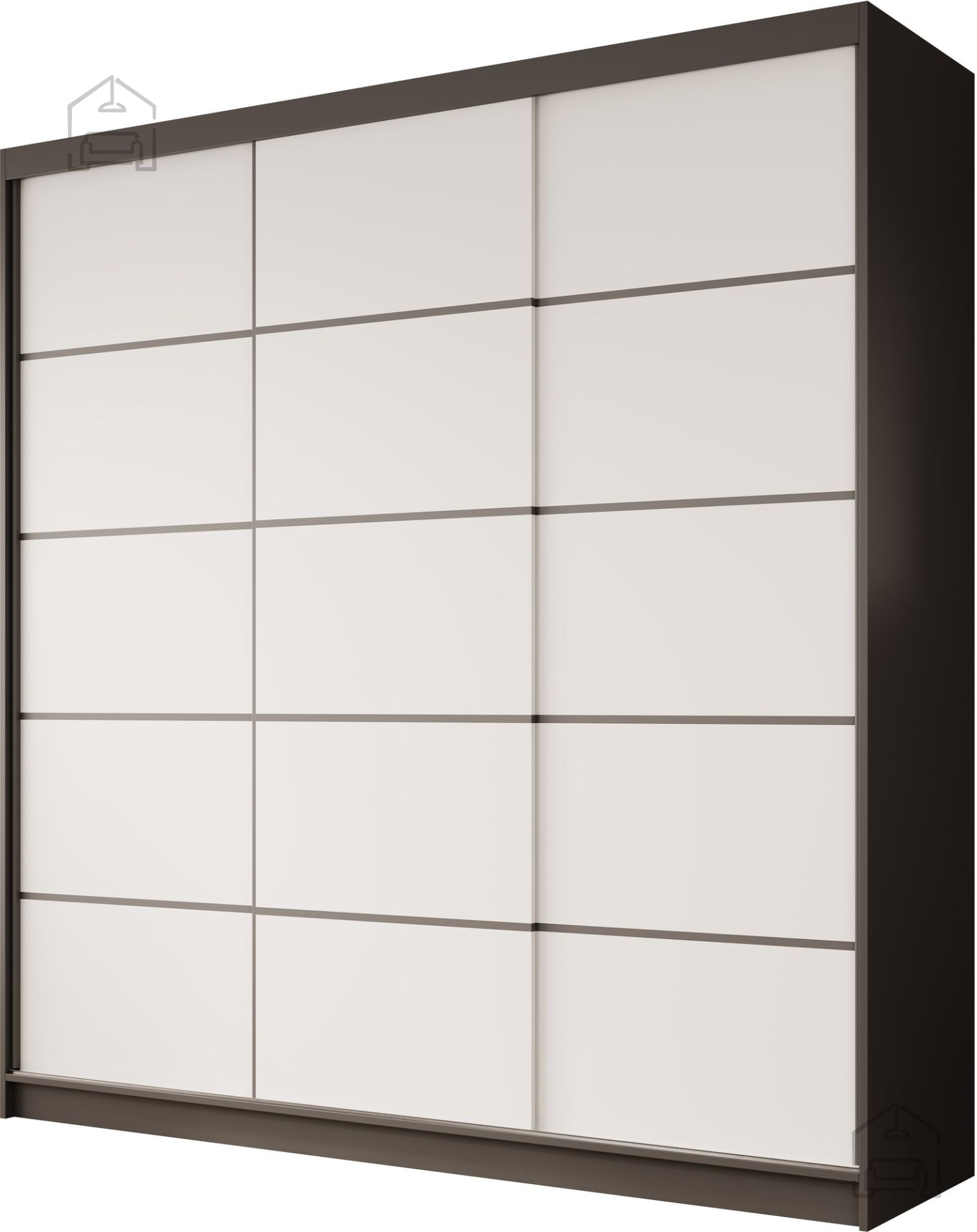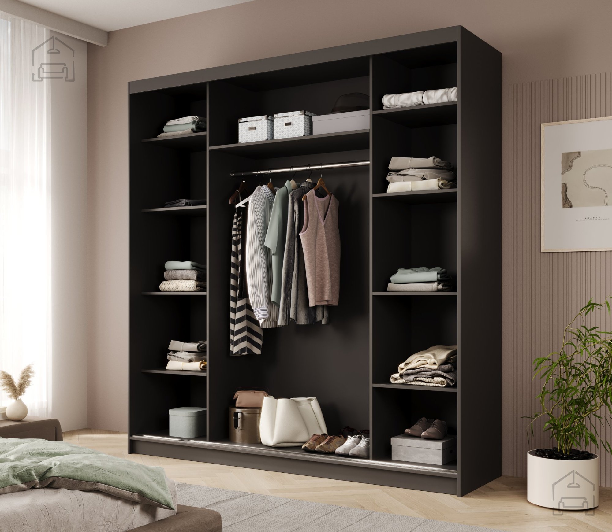 Der elegante und großzügige Kleiderschrank mit Schiebetüren ist die ideale Lösung für alle, die in ihrem Zuhause modernes Design, Funktionalität und dauerhafte Qualität vereinen möchten. Dank der harmonischen Farbkombination aus Schwarz und Weiß lässt er sich mühelos in verschiedenste Einrichtungsstile integrieren – vom minimalistischen bis hin zum klassischen Ambiente.