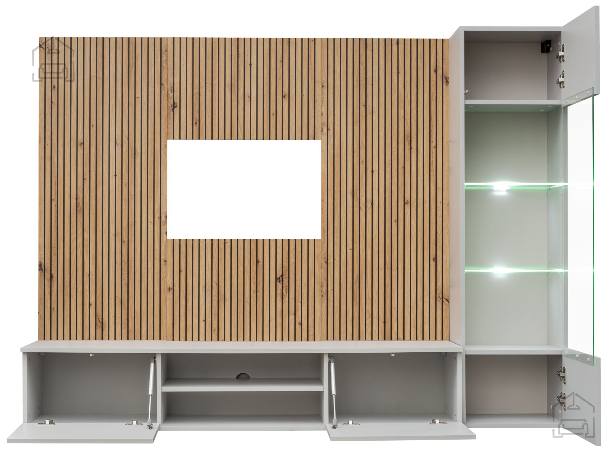 Gefertigt aus hochwertiger Spanplatte, vereint die Wohnwand Xari L Eleganz und Langlebigkeit. Ihre Farbkombination aus Perlengrau und Artisan-Eiche verleiht jedem Zuhause ein warmes und einladendes Aussehen. Schwarze vertikale Streifen als Applikation fügen einen Hauch von Modernität hinzu und schaffen visuelles Interesse, das jeden Blick auf sich zieht.