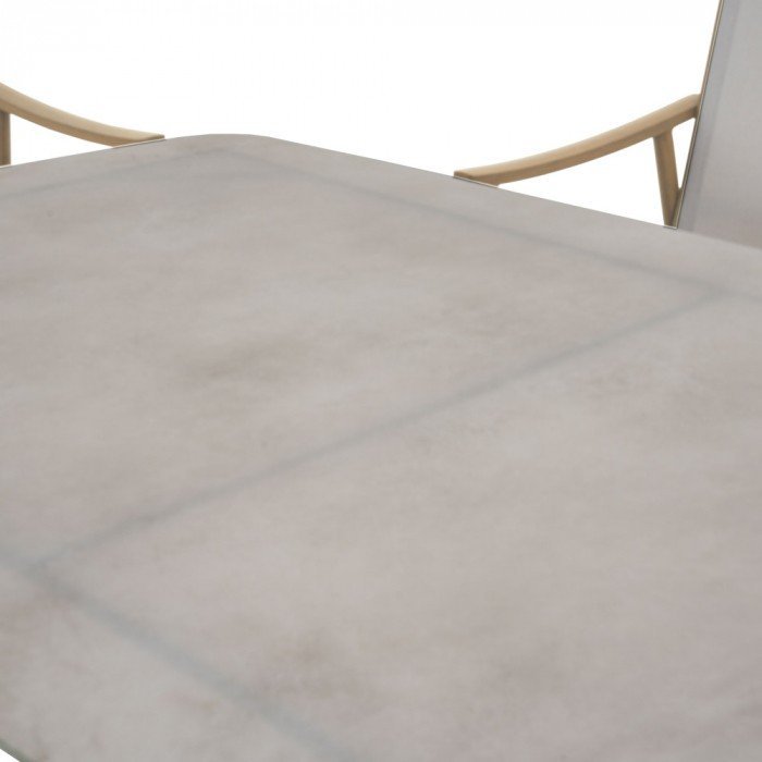 Das Gestell des Garten-Sets Napa besteht aus pulverbeschichtetem Aluminium, das widerstandsfähig gegen Rost, Feuchtigkeit und UV-Strahlung ist. Diese Beschichtung sorgt dafür, dass das Möbelstück auch nach mehreren Saisonen im Freien sein ursprüngliches Aussehen behält. Aluminium ist zudem besonders leicht, wodurch das Set einfach umgestellt oder bei Nichtgebrauch platzsparend verstaut werden kann. Die Tischplatte aus Keramik verleiht dem Ensemble einen Hauch von Luxus und ist zugleich äußerst praktisch – sie ist kratz-, hitze- und fleckenbeständig, was Reinigung und Pflege deutlich erleichtert.