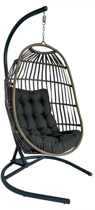 Massive Konstruktion aus pulverbeschichtetem Stahl und ein elegantes Design aus Polyrattan: der Hängesessel Kari – Mirpol. Dieser moderne Hängesessel in edlem Schwarz vereint Langlebigkeit, Ästhetik und Komfort und ist damit die ideale Wahl für entspannte Stunden auf der Terrasse, dem Balkon oder im Garten. Die hochwertige Verarbeitung sorgt für Stabilität, Witterungsbeständigkeit und eine lange Lebensdauer, während die durchdachte, kokongleiche Form der Sitzschale ein Gefühl von Geborgenheit und Behaglichkeit vermittelt. Der weich gepolsterte Sitz mit bequemen Kissen lädt dazu ein, sich nach einem langen Tag sanft schaukelnd zu entspannen.