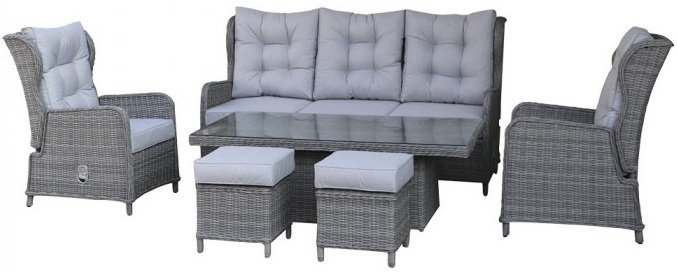 Das Gartenmöbel-Set Verdi besteht aus einem großzügigen Sofa, zwei bequemen Sesseln, einem praktischen Hocker und einem großen Tisch mit Gaslift-Mechanismus, der eine einfache Höhenverstellung ermöglicht. So kann der Tisch entweder als Couchtisch für gemütliche Kaffeerunden oder auf Esstischhöhe für ein Mittagessen im Freien genutzt werden. Die Tischplatte aus 5 mm starkem Sicherheitsglas ist kratzfest, wetterbeständig und verleiht dem Set eine elegante Note.