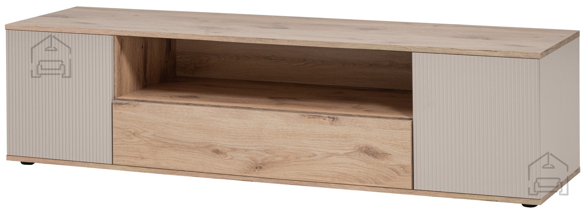 Die Kommode Catalina wird Sie mit ihrer Farbkombination aus Viking-Eiche und Kashmir begeistern, die jedem Raum Wärme und Raffinesse verleiht. Die Türen der Kommode sind mit dekorativen MDF-Rillen versehen, was zu ihrem eleganten Aussehen beiträgt. Die Kommode bietet zwei Türen mit Innenfächern, die eine organisierte Aufbewahrung Ihrer Dinge ermöglichen. In der Mitte befindet sich ein offener Bereich, der ideal für die Platzierung von Multimedia-Geräten wie DVD-Player oder Fernsehempfänger ist, während zusätzliche Türen eine diskrete Aufbewahrung gewährleisten.